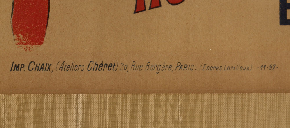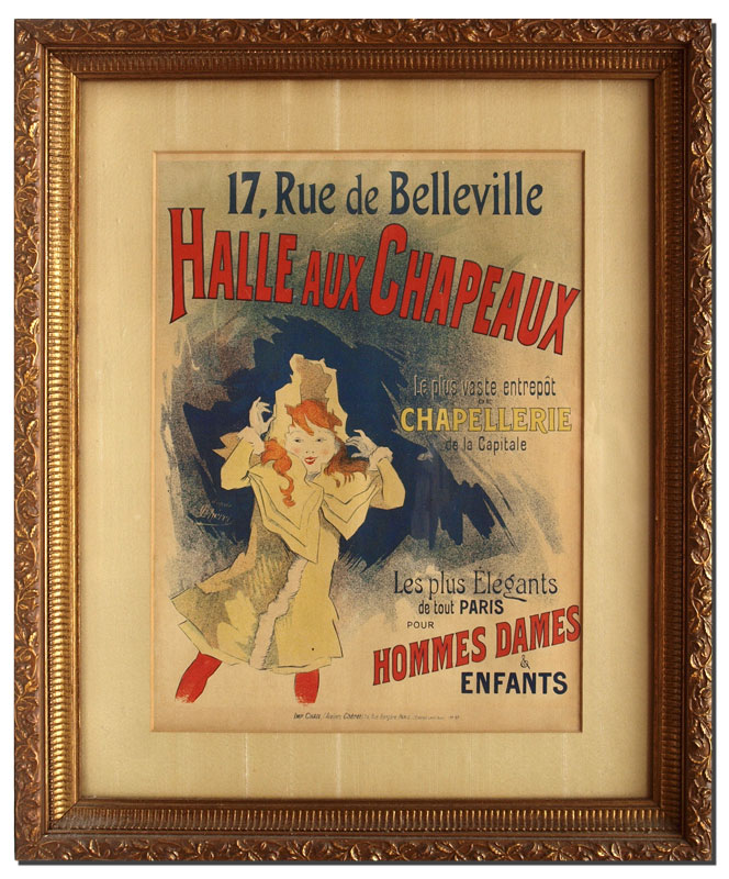 HALLE AUX CHAPEAUX FRENCH ADVERTISING POSTER: Designed by Jules Cheret, lithograph advertisement for Halle Aux Chapeaux featuring a young girl. Printed by Chaix, Paris 1897. Sight size 15'' x 11'', framed and matted under glass 22'' x 17 3/4''.