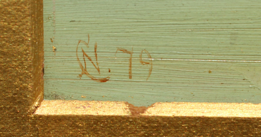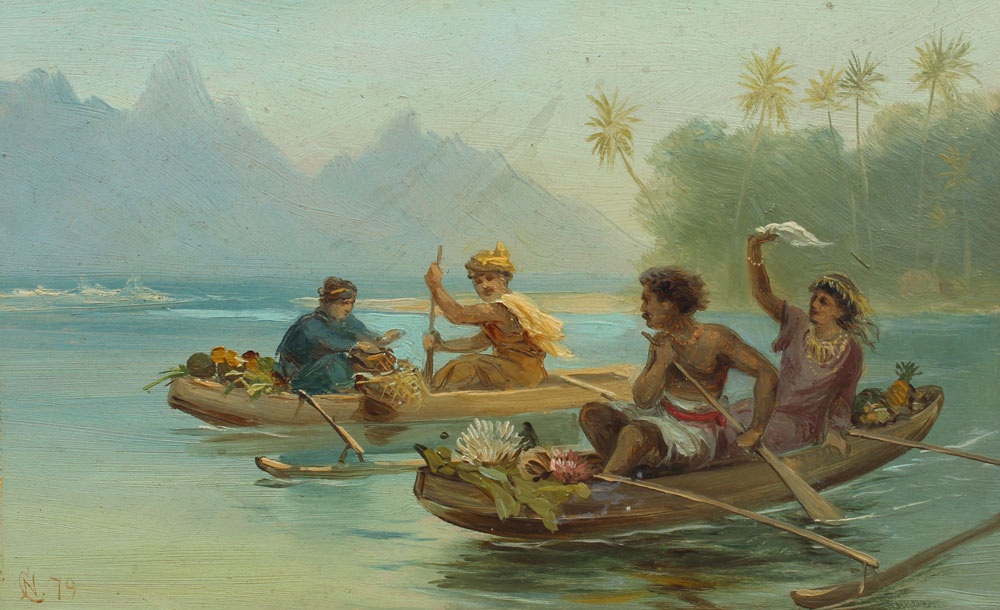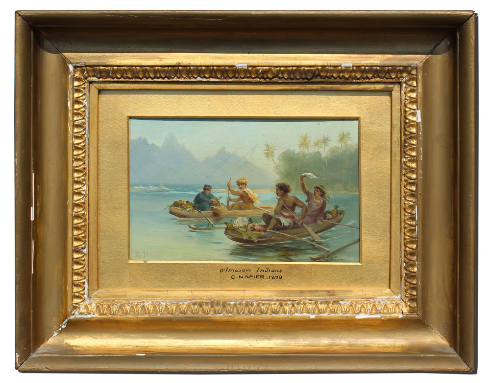 19TH CENTURY PAINTING BY C. NAPIER, ''AMAZON INDIANS'': Scene depicts figures paddling in outrigger canoes on a river in South America, Oil/Paper, affixed to masonite board, 5'' X 8'', monogrammed lower left ''CN'', dated '79, encased in a period gilded gesso frame with wear and gold overpaint, 11 3/4'' x 15''.
