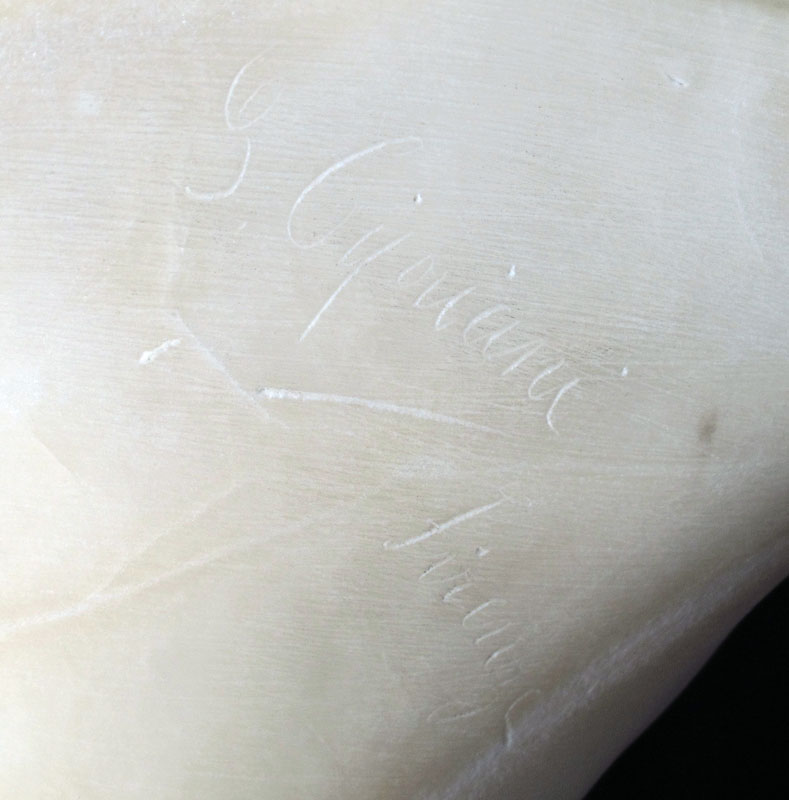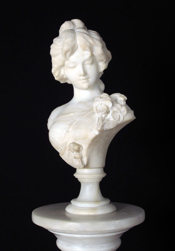CIPRIANI, G., (Italian, 19th Century): Alabaster Bust of Evelyn Nesbit, 14'' h., affixed to a beveled detachable plinth, 17 1/2''. Sold with a beveled bi-colored marble pedestal, 43 1/2''h., allows a rotating movement with 360 degree views. The sculpture is signed verso, incised ''Firenze''.