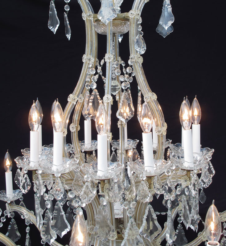 LARGE CRYSTAL 2 TIER CHANDELIER: 2 tiers of 12 lights each with central light, garland and hanging prisms. Measures approx. 43'' h. x 41''.