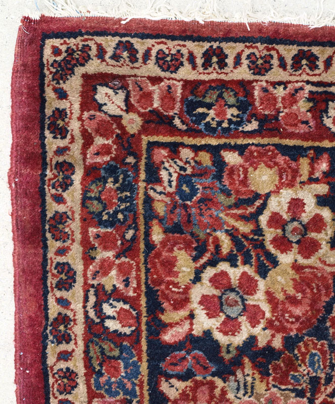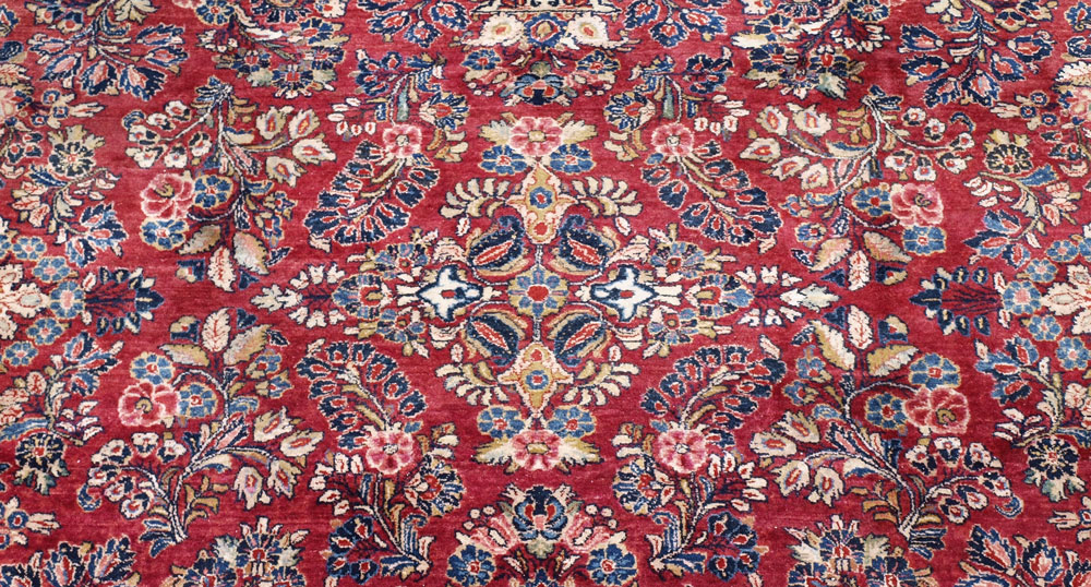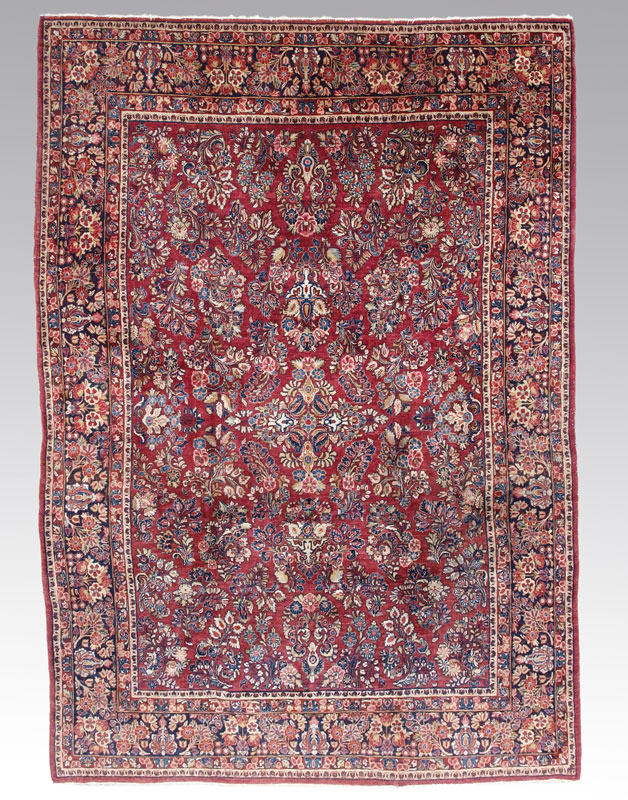 SEMI-ANTIQUE PERSIAN SAROUK HAND KNOTTED WOOL RUG, 8' 10'' x 11' 8'': This pretty room size Sarouk was woven with traditional motifs and colors that, in this rug, come together very well. The soft red of the field is covered with sprays of various flowers in a palette of reds, blues, white, and soft yellow.
