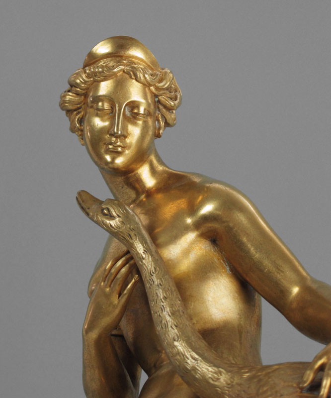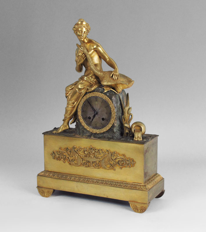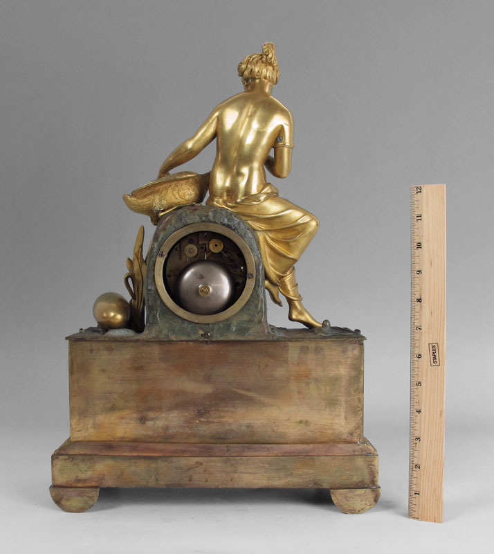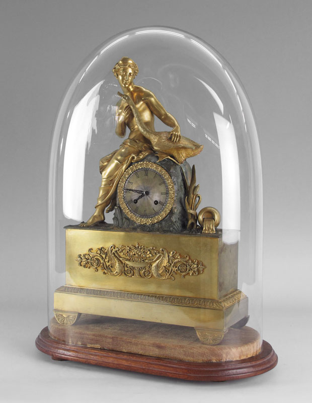 FRENCH FIGURAL DORE BRONZE SILK THREAD CLOCK: Figural seated partial nude maiden with swan, reeds and urn, mixed metal dial with no crystal, applied foliate scroll design on 4 feet. French silk thread time and strike movement marked FC, 8-1, 3095. Key and pendulum in office. Clock measures 18 1/2'' h. x 12 1/2'' x 5 1/2''. Sold with stand and glass dome, overall 22 1/4'' x 17'' x 9 1/2''.