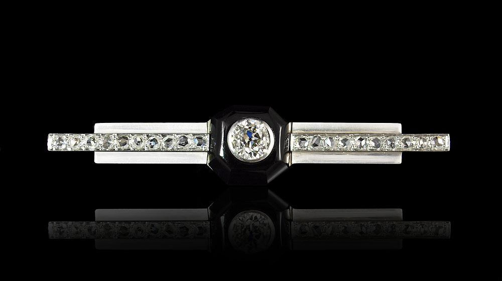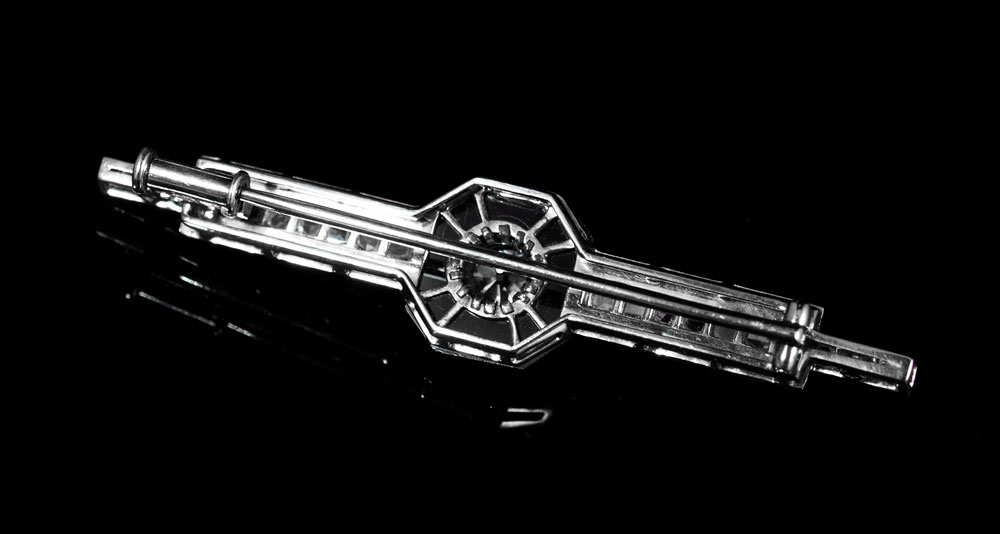 ART DECO PLATINUM DIAMOND & ONYX PIN: Platinum Art Deco diamond and onyx pin centers one old mine cut diamond and 20 round rose cut diamonds, all totaling approx. 1.00 Ct., rated VS in clarity and H-I in color. The onyx is an octagonal sugarloaf cut piece. The diamonds are bezel and bead set. Bar pin closure. Length: 2''. Weight: 5.5 grams.