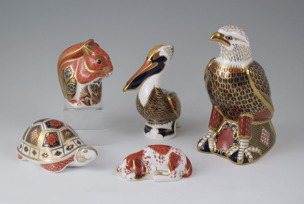5 PC CROWN DERBY IMARI ANIMAL FORM PAPERWEIGHTS: 1) Club exclusive Puppy, 3 1/2''L. 2) Eagle, 7'' tall. 3) Squirrel, 3 1/2''h. 4) Brown Pelican, 5'' tall, and 5) Turtle, 5'' length.