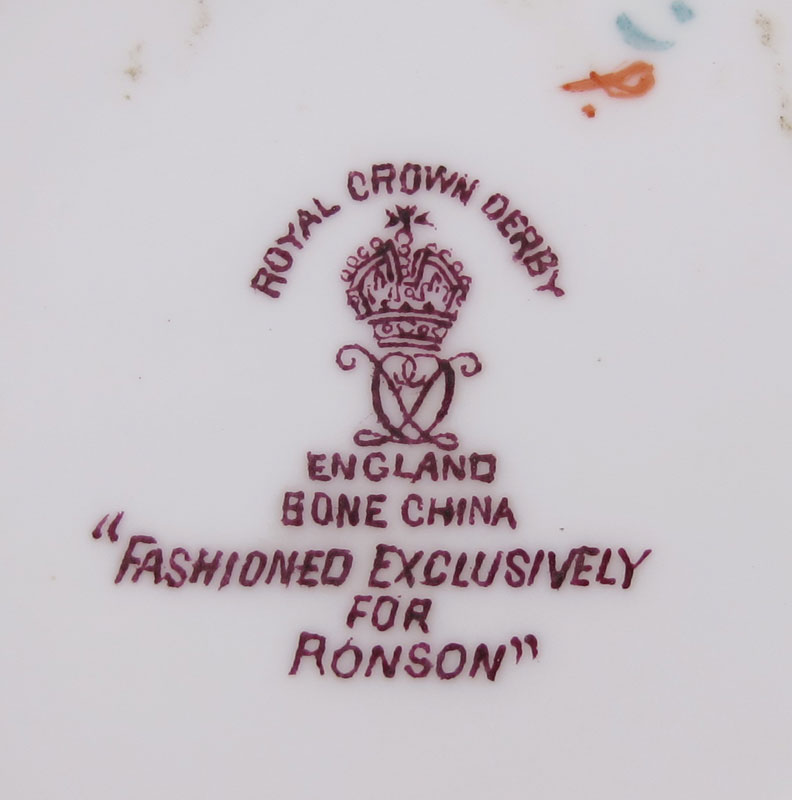 10 PC ROYAL CROWN DERBY FINE CHINA PIECES: To include in the Old Imari 1128: The 3'' and miniature 1 1/4'' loving cups, Ronson exclusive table lighter and 4 pin trays. A commemorative dish signed by Hugh Gibson, 4'' dia. And a Red Aves creamer and underplate.