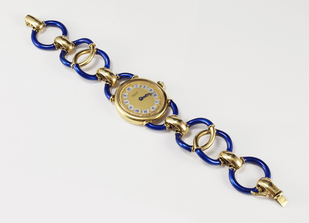 SARCAR LADIES LUXURY WATCH: 18K yellow gold watch and bracelet. The unusual circle links are cobalt enameled. Oval silver and gold dial with Roman numerals. Swiss made quartz movement in running order. Weight: 60.1 grams inclusive. Sold with current Florida Diamond Appraisers GIA graduates appraisal for $8,000.