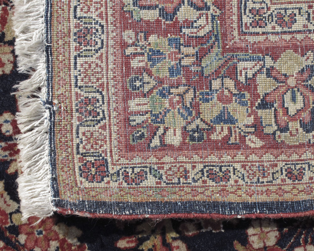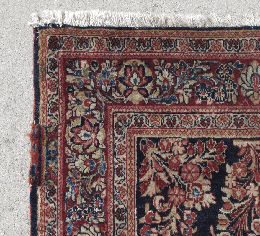 ANTIQUE PERSIAN SAROUK HAND KNOTTED WOOL RUG, 4' 2'' x 6' 4'': This Sarouk is a more unusual rug because it has a blue field instead of the more common red ground. The field is covered with a pattern of floral sprays around a central floral spray medallion. The colors in the sprays and the borders of the rug are red, light blue, pale yellow and pale green and white. The ground of the main border is red. It is filled with small floral motifs interspersed with larger flower heads and palmettes. The rug is attractive and desirable and would be a nice addition to your home or collection. Condition is good