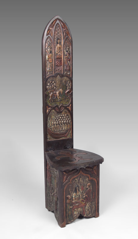 MEDIEVAL STYLE THRONE CHAIR: Carved back medieval motifs on back with applied brass masquerons verso. Hinged lid seat with carved fleur de lis, carved genre motifs base. Actual age unknown, 54'' h. x 14'' x 18''. CONDITION: Note scratches and gouges.