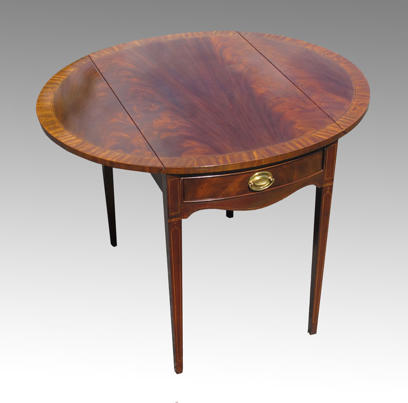 DREXEL HERITAGE HEIRLOOM PEMBROKE TABLE: Banded mahogany, drop leaf, one drawer table on slender legs. Approx. 27''h. x 30'' x 19''.