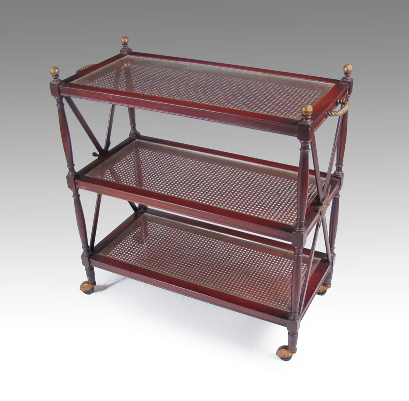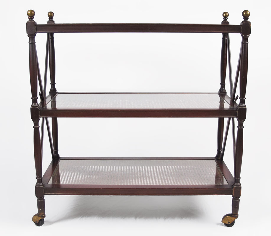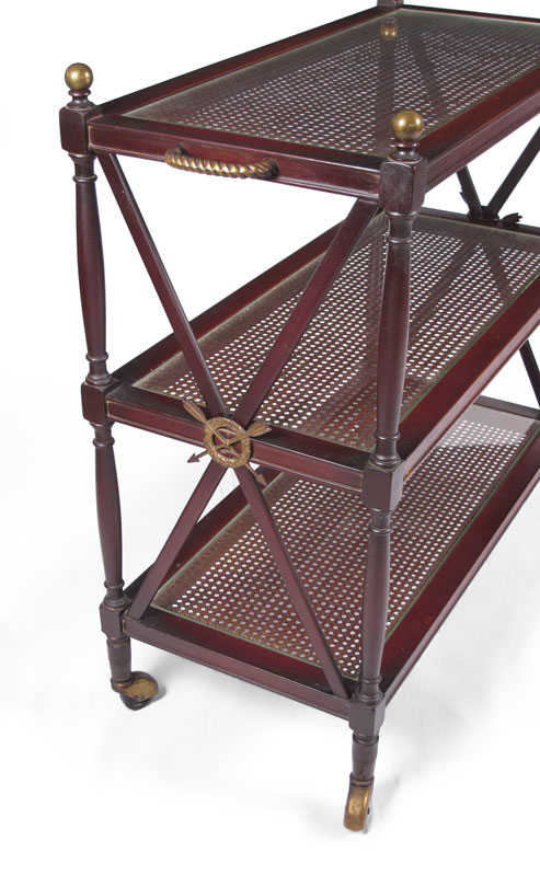 REGENCY STYLE CANED TEA SERVING CART: 3 caned tiers with glass inserts, brass finials, handles and applied decoration. On castors. 36 3/4'' h. x 37 3/4'' x 16 1/2''.
