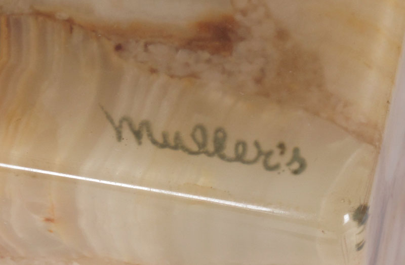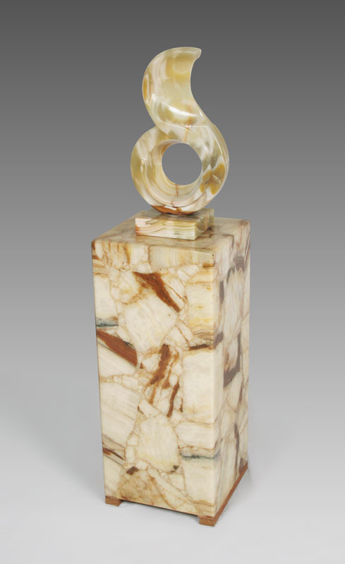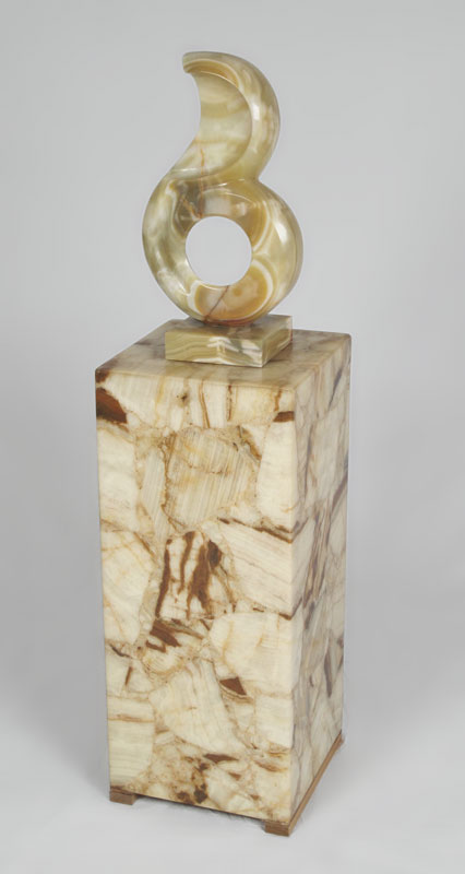 GREEN & BROWN ONYX PEDESTAL AND MODERN SCULPTURE: 17'' h., pedestal in 28'', signed Mullers.