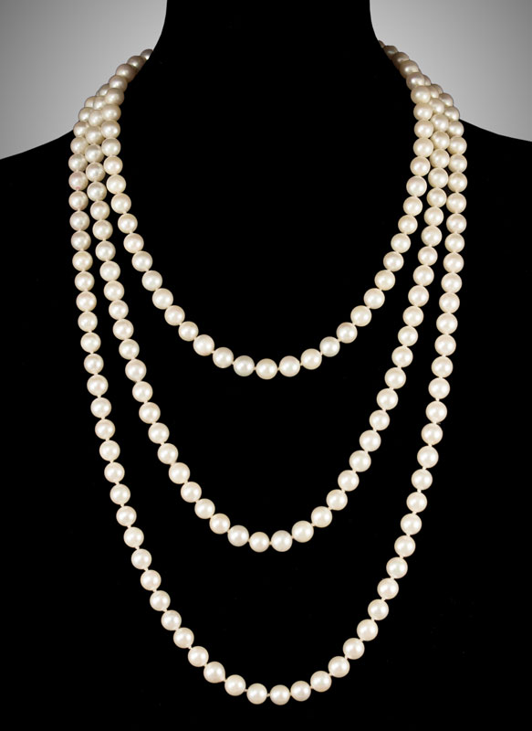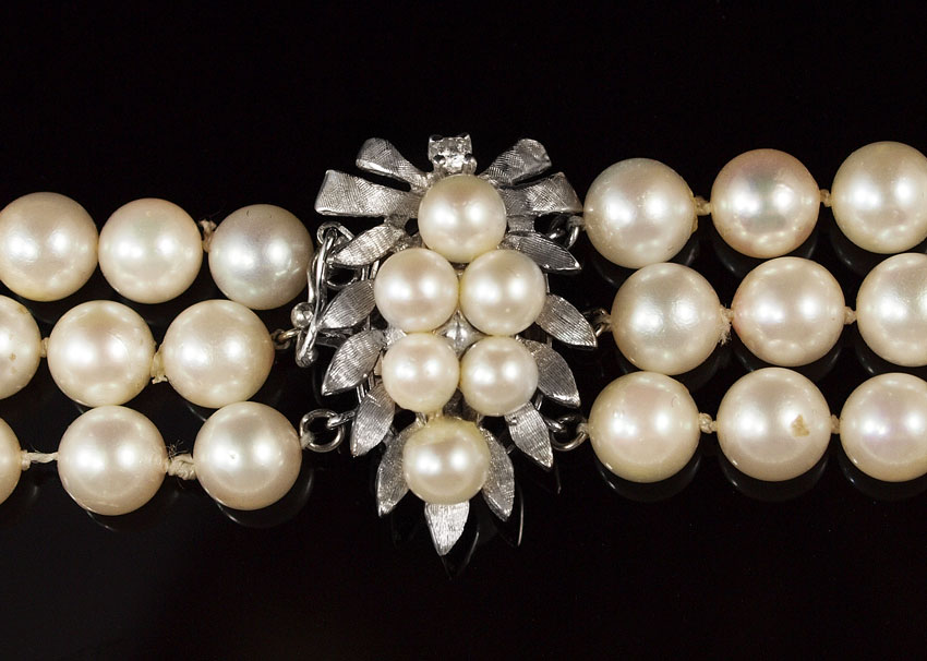 TRIPLE STRAND PEARL NECKLACE: Three Strands of 6.50-7.00 mm cultured pearls. Light cream in color, blemished with low luster. The 14K white gold leaf shaped clasp contains 6 5.00 mm cultured pearls. Figure eight safety clasp. 24'' in length. Gold weight: 4.0 grams approx.