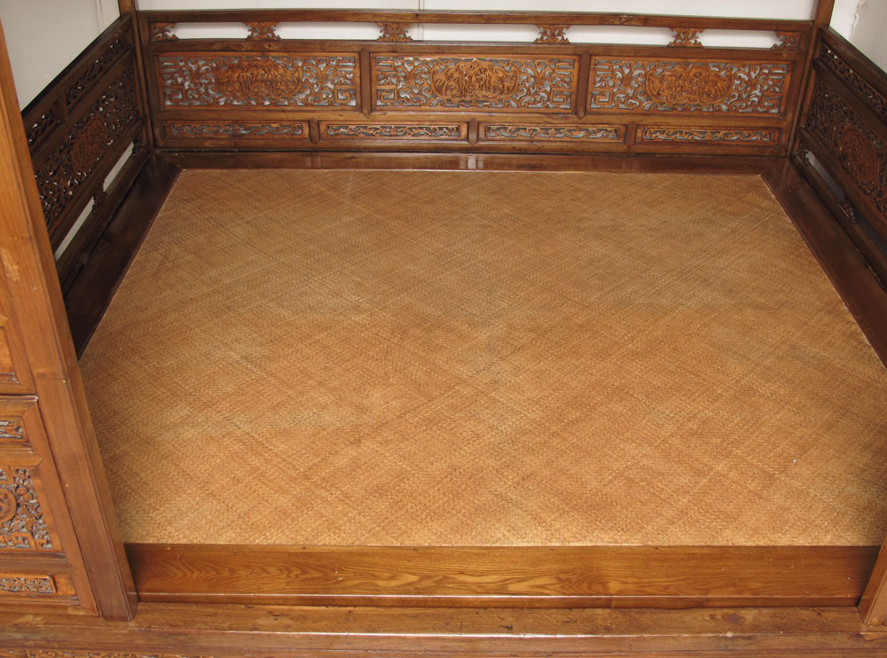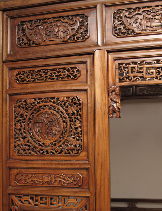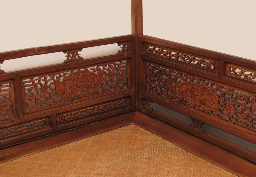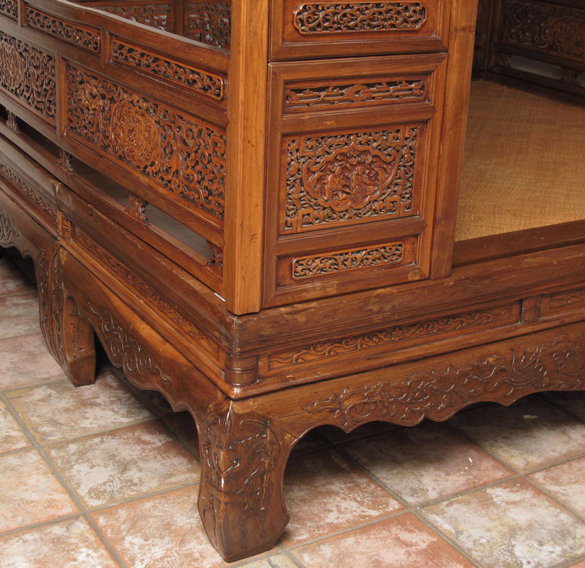 CHINESE CANOPY WEDDING BED CHAMBER: Platform encased in pierce carved panels. 7 ft. tall, base measures 6'3'' x 7'2''.