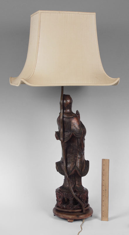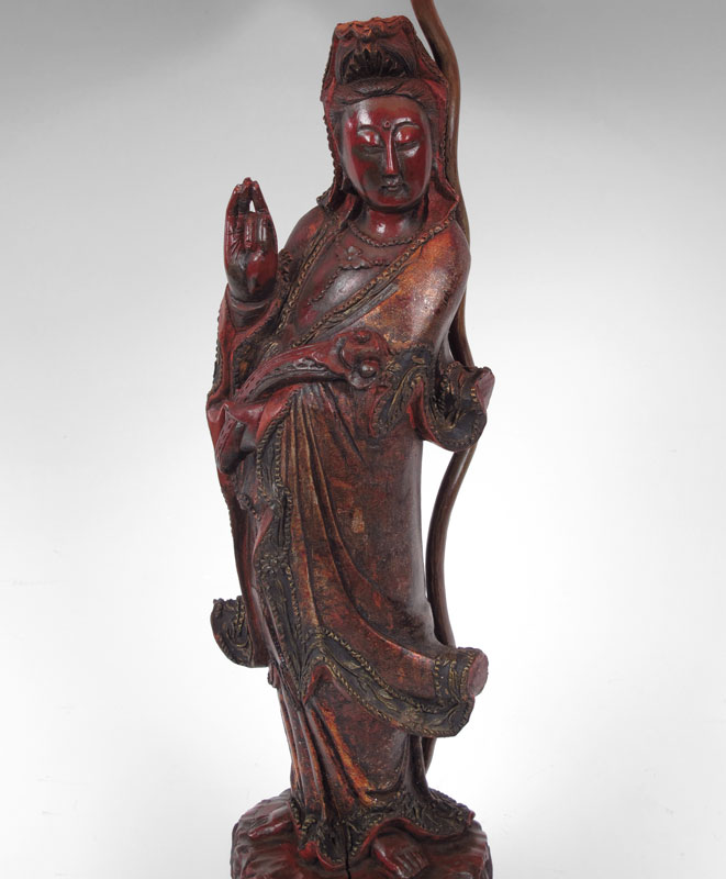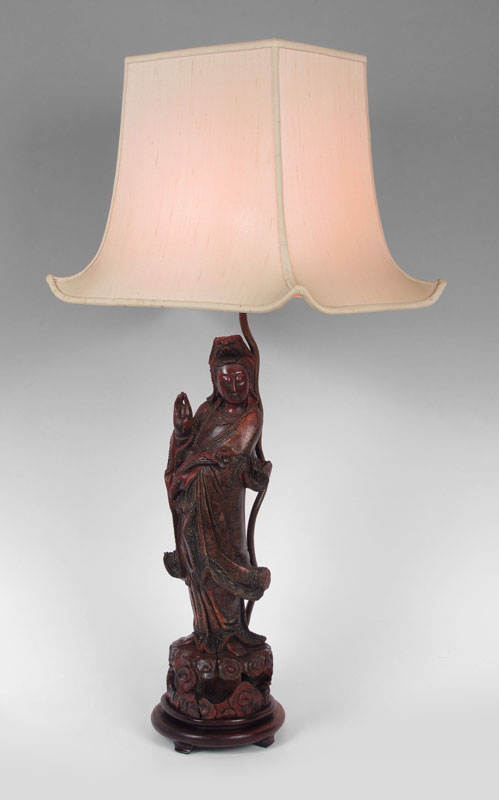 CARVED WOOD QUAN YIN LAMP: Carved wood lamp base in the form of Quan Yin, single light, shaped shade. Base measures 28 1/4'' to top of socket x 8 1/4'', shade 13 3/4'' h. x 19'' x 13 1/4''.