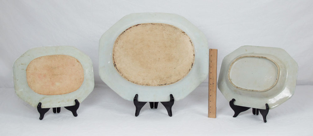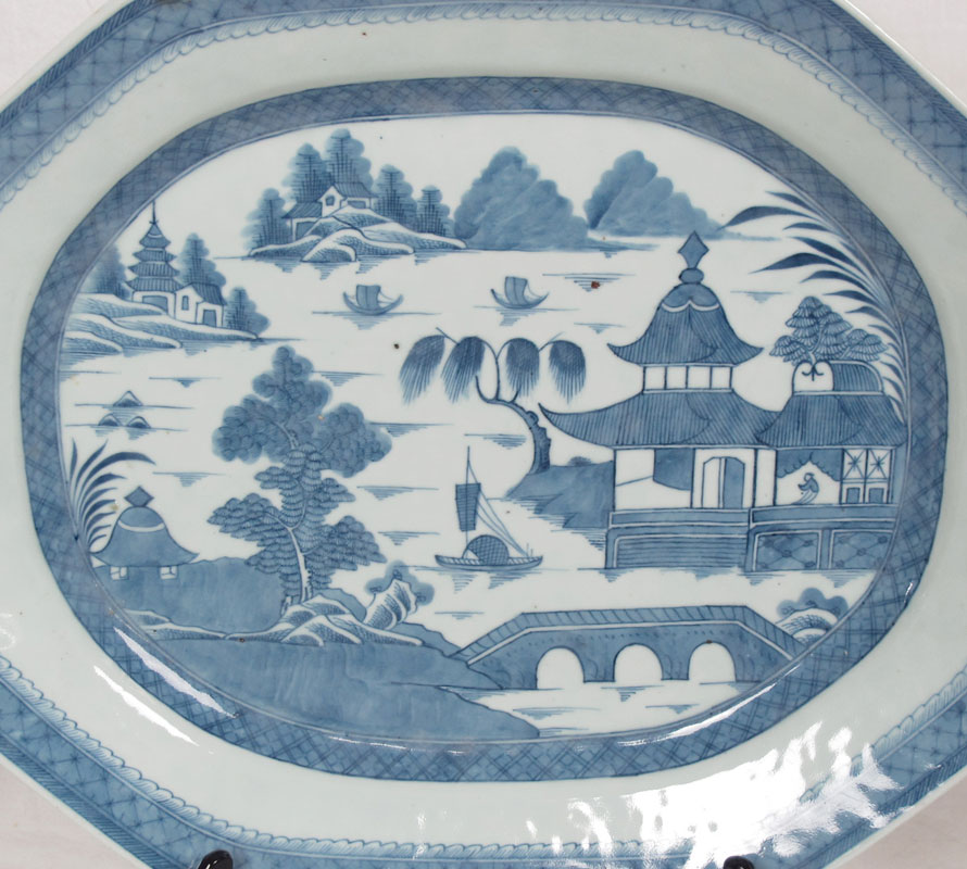 3 CANTON BLUE AND WHITE OCTAGONAL PLATTERS: The largest being 18 1/2'' x 16 1/4''. The smallest measures 14'' x 10 3/4''. Classic waterfront landscape with border.