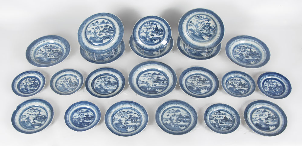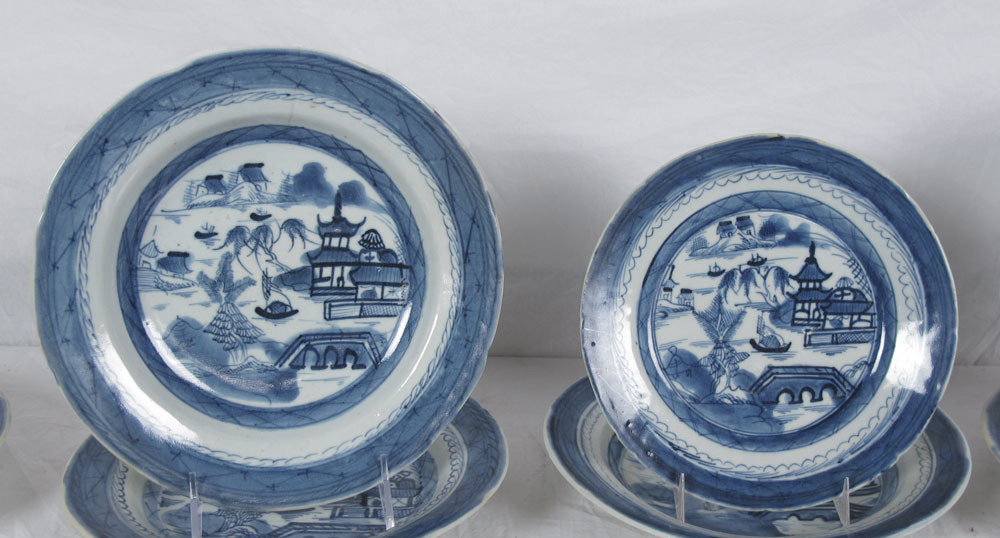 CANTON BLUE AND WHITE TABLE WARE: 21 pc group to include 8 shallow bowls (8'' dia.), 6 plates (6 1/4''), and 7 plates (7 3/4'').