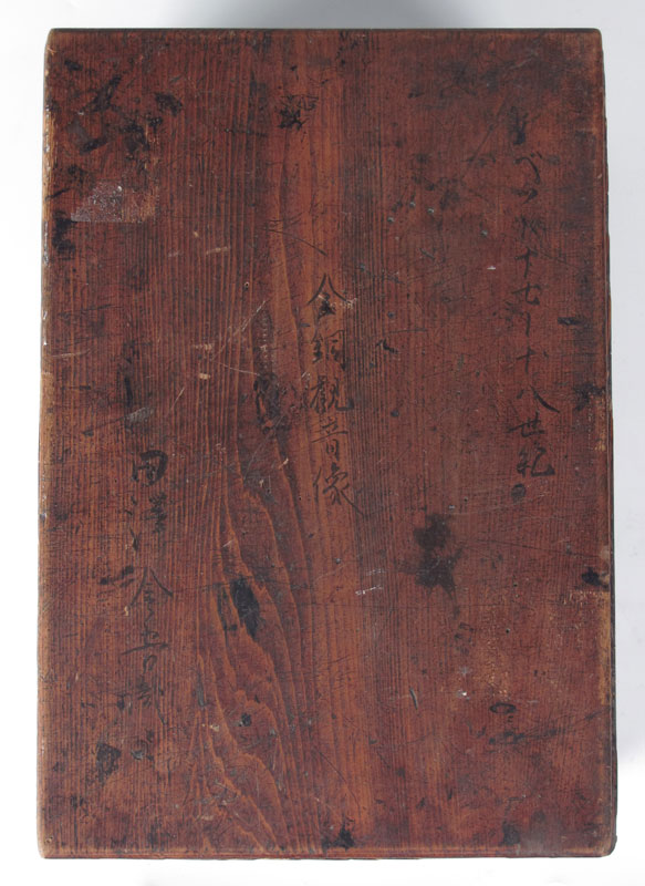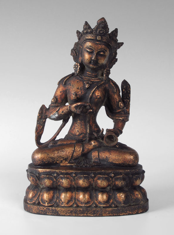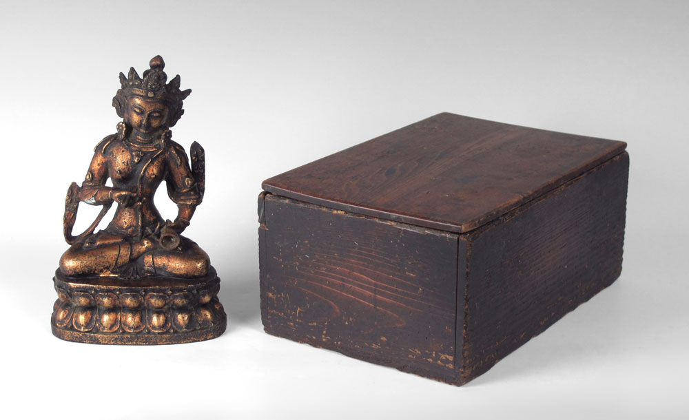 TIBETAN BRONZE BUDDHA IN WOODEN BOX: Seated Tibetan Buddha holding vajra in upturned right hand and bell in left, seated in lotus position on a lotus throne. Sold with wooden box with Japanese writing translating as ''Tibet 17-18 century, Gold Bronze Kannon Statue approved by Kingo Tazawa''. Actual age of bronze unknown. Bronze measures 11 1/2'' h. x 7 1/4'' x 4 1/4''. Box measures 6 5/8'' h. x 14 1/4'' x 10''.