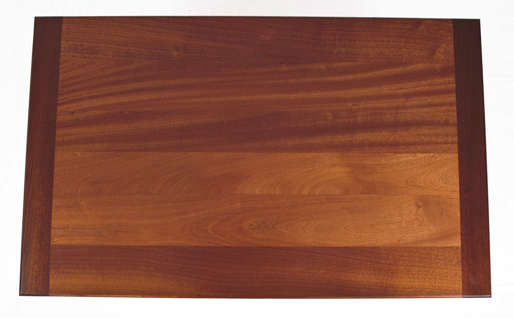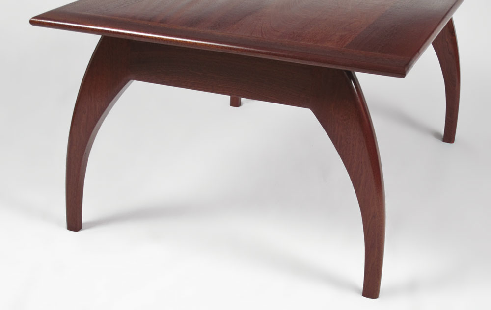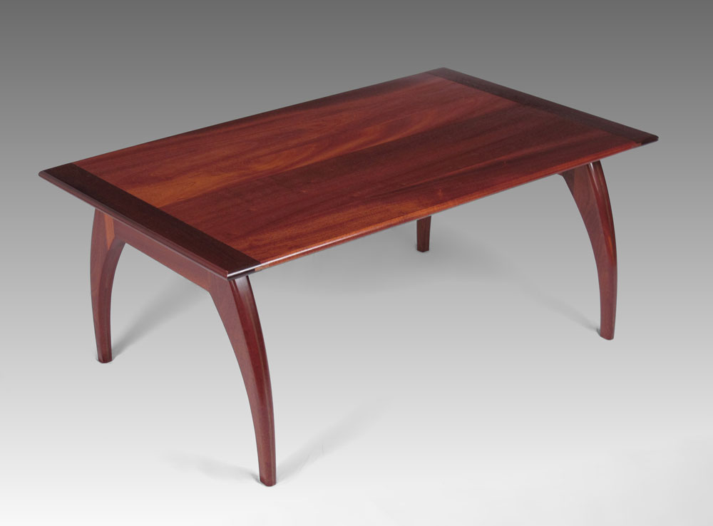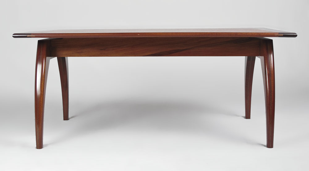 AMERICAN CRAFTSMAN MODERNIST MAHOGANY COFFEE TABLE: Mahogany top, shaped legs. 17 1/4'' h. x 41 1/2'' x 25 1/2''.