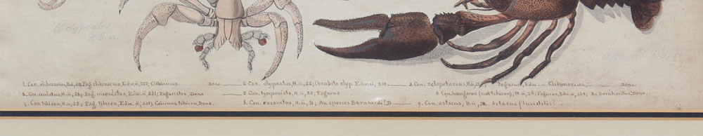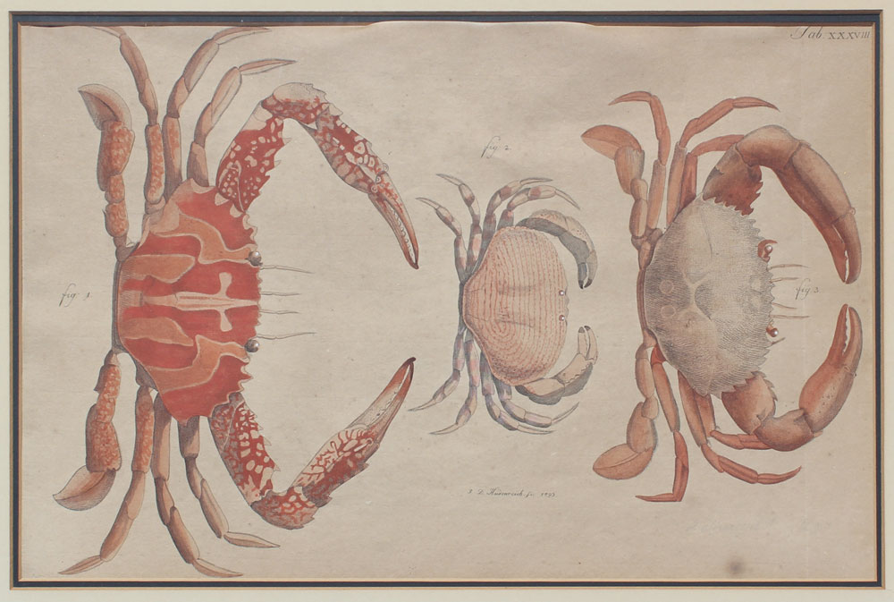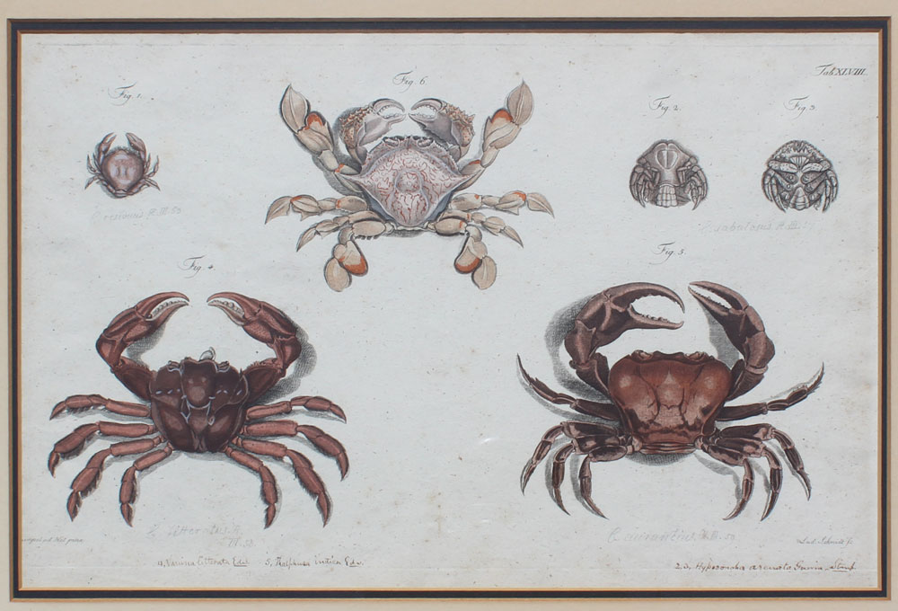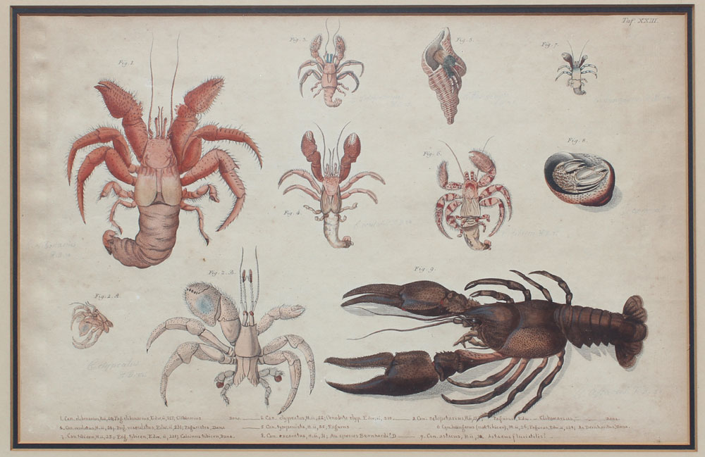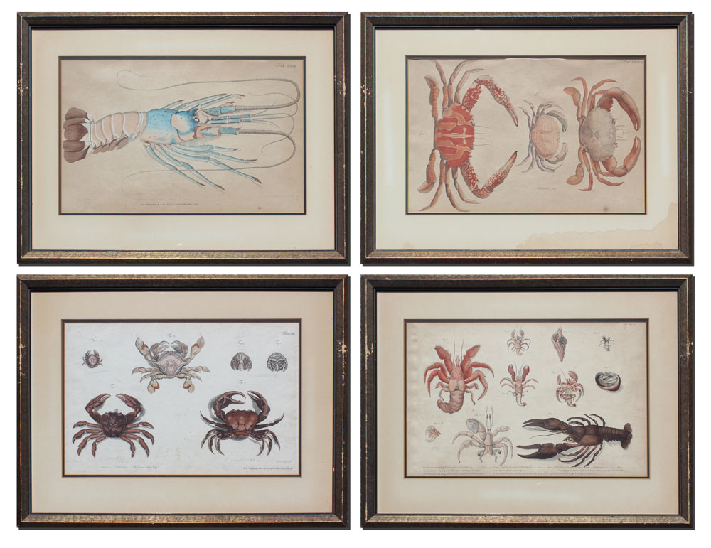 4 EARLY CRUSTACEAN ENGRAVINGS: Possibly 19th Century or earlier, 2 of the prints are by Heiden Reich, one by Schmidt, sizes vary but average 11'' x 17'', contemporary gilded framed with wear 18'' x 24 1/4''.