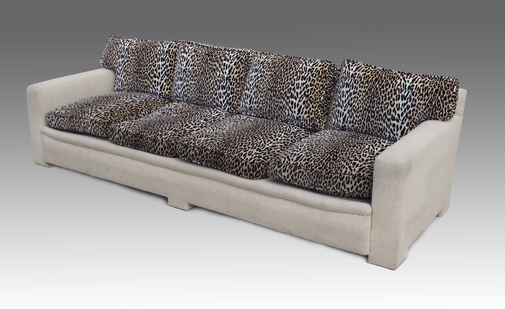 DE ANGELIS CUSTOM SOFA: Custom made by the D'Angelis Company in New York. Beige textured upholstery with leopard print seat and back cushions. 27 1/2'' h. x 10'' x 42''.