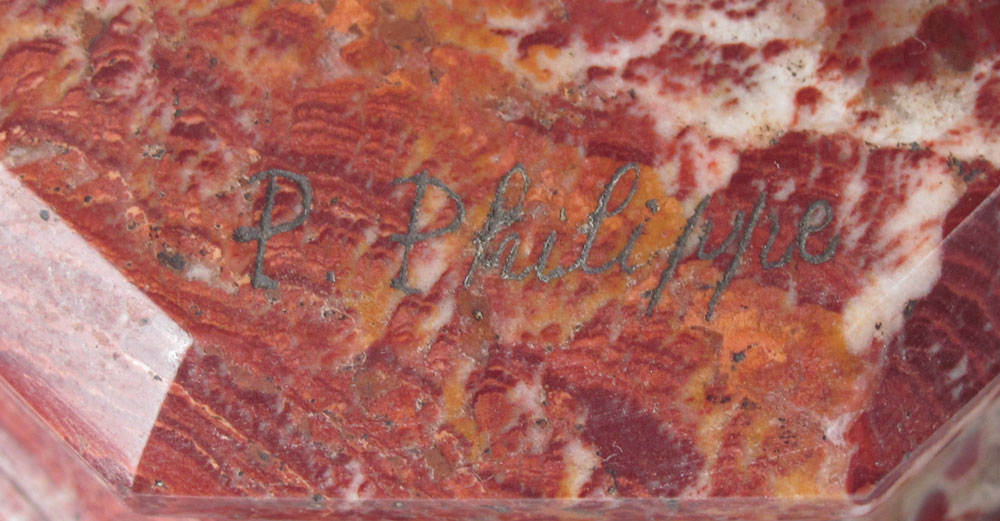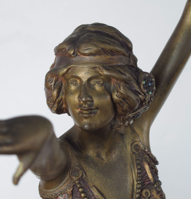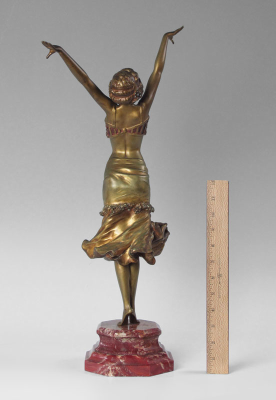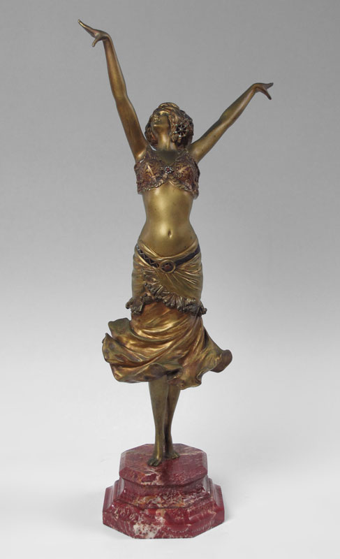 PHILIPPE, Paul, (FRENCH, 1895-1981): ''Radha'' depicting a harem dancer, Bronze, Approx, 20'' h., original red beveled marble plinth, overall 22 3/4'' h, incised signature to plinth.