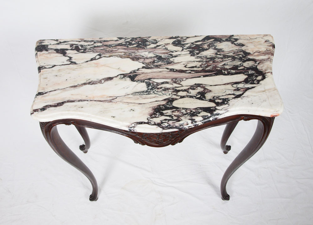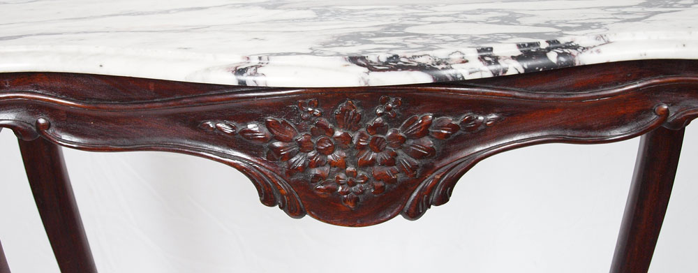 TALL MAHOGANY CARVED CONSOLE WITH MARBLE TOP: Shaped marble top, flower carved apron, and long cabriolet legs. 38'' h. x 35'' x 15 1/2''.