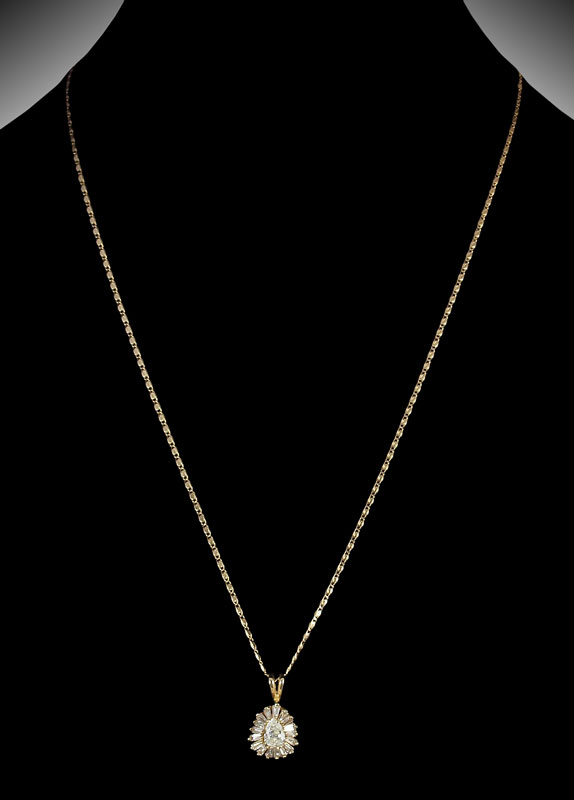 14K DIAMOND PENDANT NECKLACE: 14K yellow gold pendant contains one pear brilliant cut diamond and 17 baguette cut diamonds. Weight: .50 Ct. Approx. The diamonds average VS-SI in clarity and H-I in color. 18'' 14K link chain. Weight: 4.1 grams