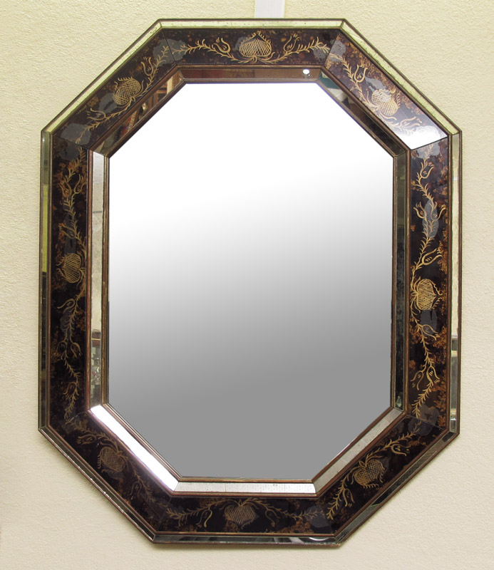 BLACK REVERSE PAINTED DECORATED MIRROR: Reverse painted floral motif stepped frame surrounding central mirror. 44'' h. x 34 1/4'' x 2''.