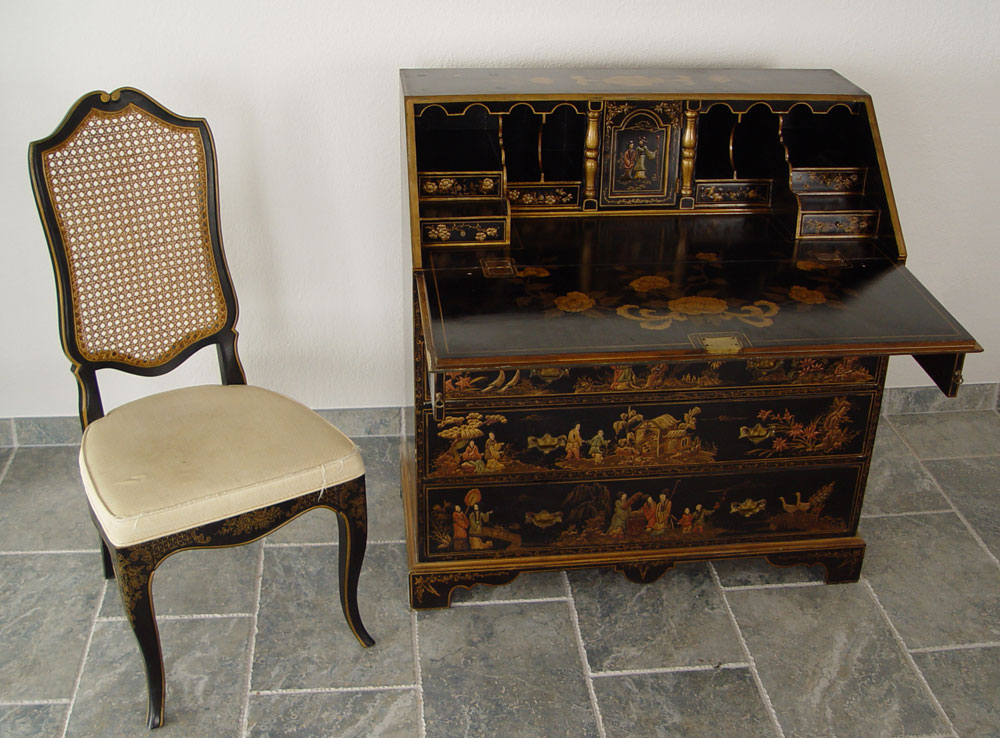 CHINOISERIE SLANT FRONT DESK AND CHAIR: To include 1) Slant front desk with raised and painted decoration of front and 2 half drawers over 3 full length drawers. 41'' h. x 38'' x 20 1/8''. 2) Caned back chair with white upholstered seat. 41 1/4'' h. x 19 1/4'' x 23 1/2''.