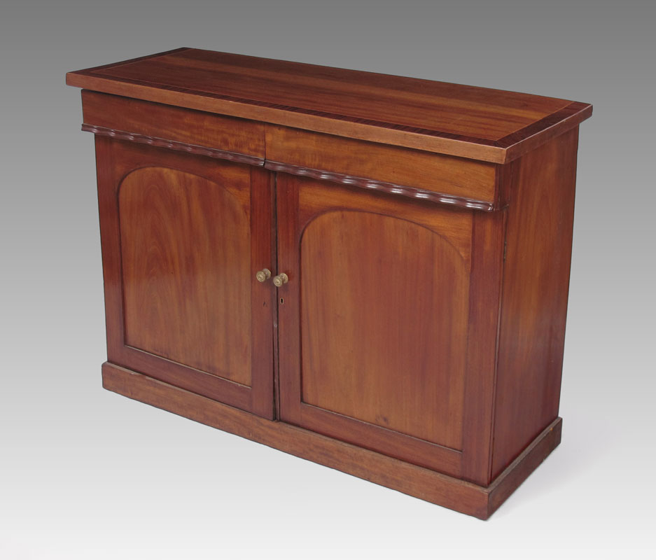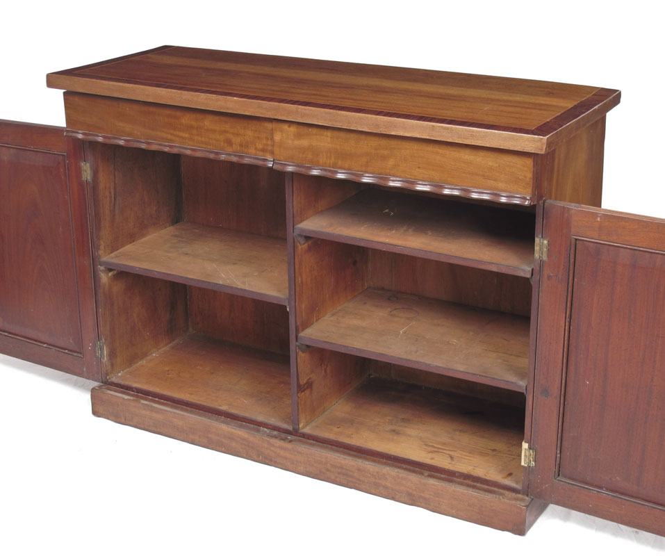 MAHOGANY GEORGIAN SIDEBOARD: Mahogany top with string inlay and cross banded mahogany border. 2 half drawers with scalloped lower trim over 2 doors with 2 internal shelves. 35 1/2'' h. x 48'' x 18 1/4''.