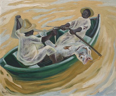 MEZA, Jose Reyes, (Mexican, 1924-): Fishermen Hauling in the Day's Catch, Oil/Masonite, 14'' x 17'', signed lower left, dated '49, gilded frame with wear, 19'' x 21 3/4''.