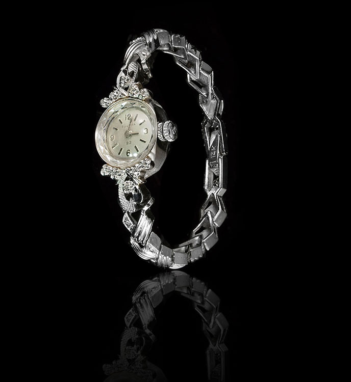 14K BULOVA LADIES DIAMOND DRESS WATCH CA. 1965: 14K white gold watch and band. The integrated band and watch have approx. 24 diamonds. 17 jewel Swiss mechanical movement in working order. White lined dial with Arabic numerals and stick hands Serial number 203480. Model Classic. Original Bulova velvet box.