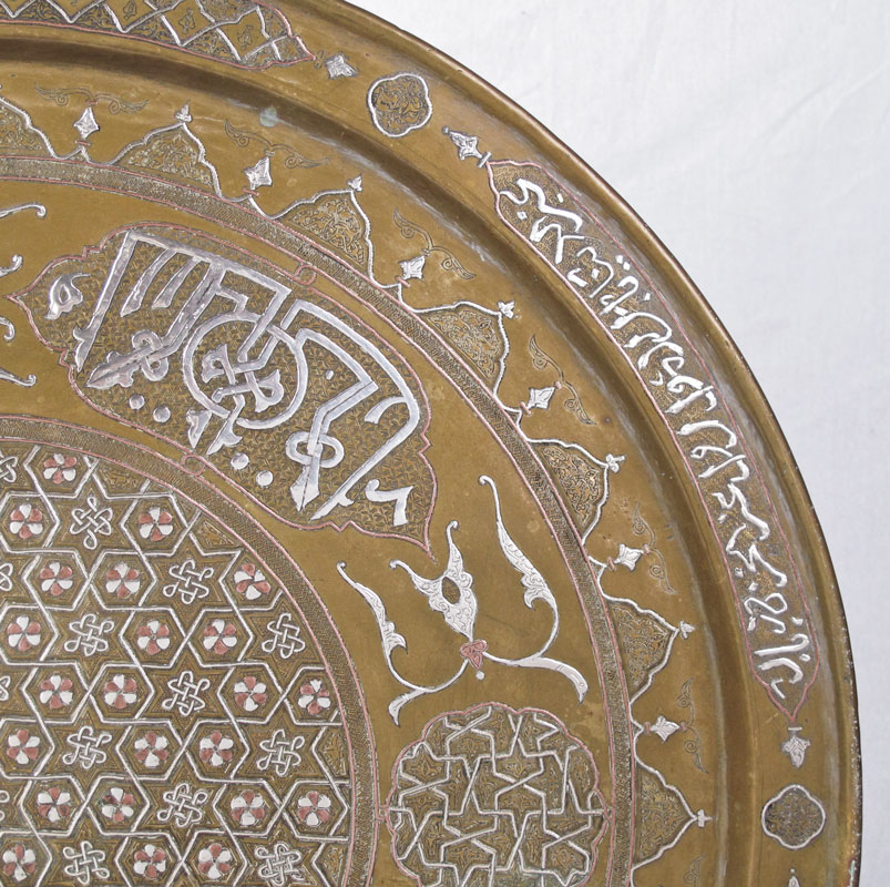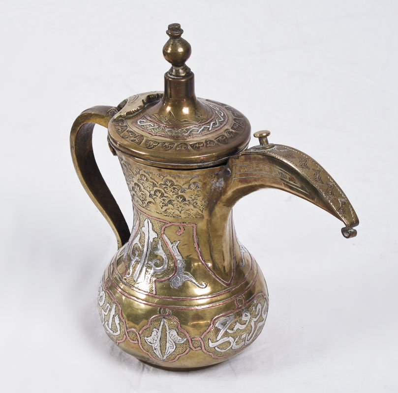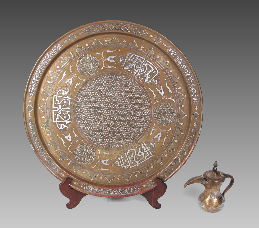 2 PIECE ISLAMIC MIXED METAL TRAY AND COFFEE POT: To include 1) Mixed metal round tray with possibly silver inlays of Arabic writing, figural birds and geometric designs. 25 1/4'' dia. 2) Turkish coffee pot, mixed metal and possibly silver inlays of Arabic writing and geometric designs. 8'' h. x 8 3/4''.