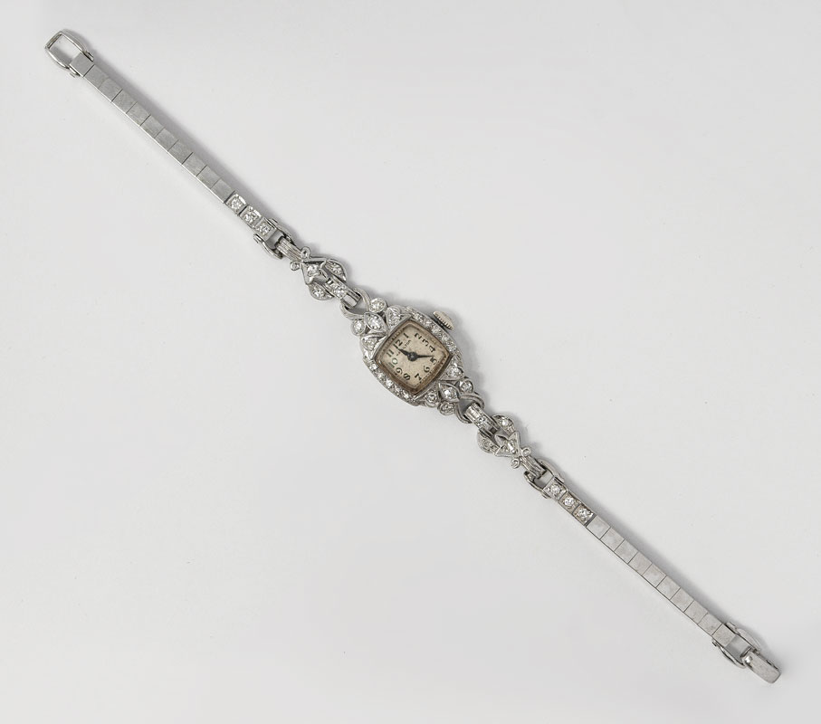 HAMILTON PLATINUM DIAMOND LADIES WRISTWATCH: Vintage 1940's platinum watch, 17 jewel Hamilton movement, serial number T438737, in running order. Original classic white dial with Dauphine hands. Original crown. The band is 14K white gold with diamond. Foldover clasp. 6 3/4''L. Overall weight 22.8 gr.