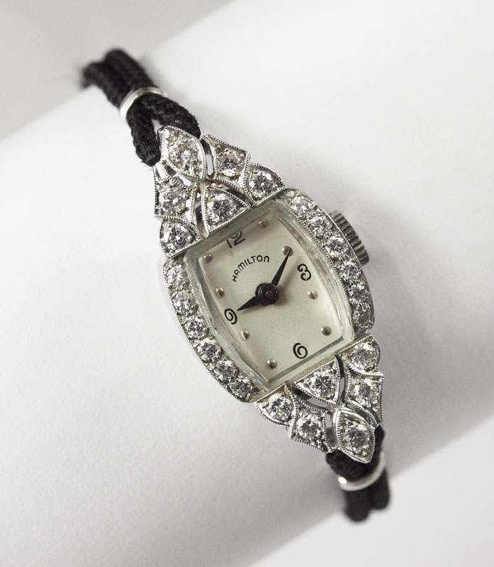 VINTAGE HAMILTON LADIES PLATINUM AND DIAMOND DRESS WATCH: Platinum watch framed in approx. 1 Ct diamonds. Case serial number 839398. Dial with Dauphine hands. Black cord band with adjustable ratchet clasp. CONDITION: Needs a cleaning in order to run.