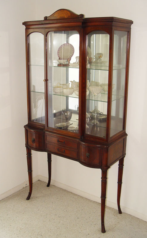 A PETITE MAHOGANY DISPLAY CURIO CABINET: Shell inlay crest over dentil molding, central glass door with glass sides. Illuminated interior with mirrored back and 2 glass shelves. Swell front corner drawers with central drawer, carved and shaped legs. Approx. 66 1/2'' h. x 33 1/2'' x 14 1/2''.