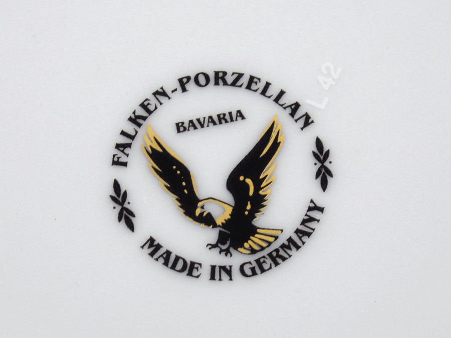 FALKEN PORZELLAN EMBOSSED PLATINUM RIM FINE CHINA: 28 pieces to include soup tureen, coffee pot, covered sugar, 2 creamers, 2 oblong platters, open vegetable bowl, and 4 each of dinner plates, soup bowls, bread plates, cups and saucers.