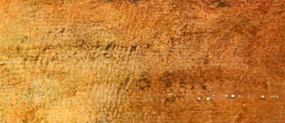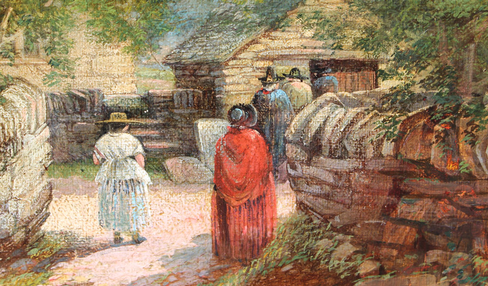 VERY GOOD 19TH CENTURY LANDSCAPE WITH FIGURES POSSIBLY PILGRIMS: OIL/Canvas, 14'' x 11'', illegibly signed lower left, dated 188?, period gesso gilded frame with missing gesso 20'' x 16 1/2''