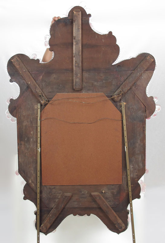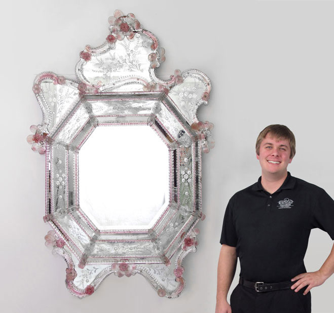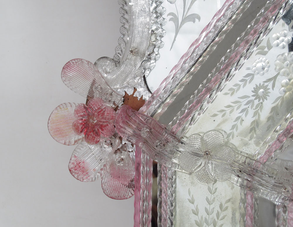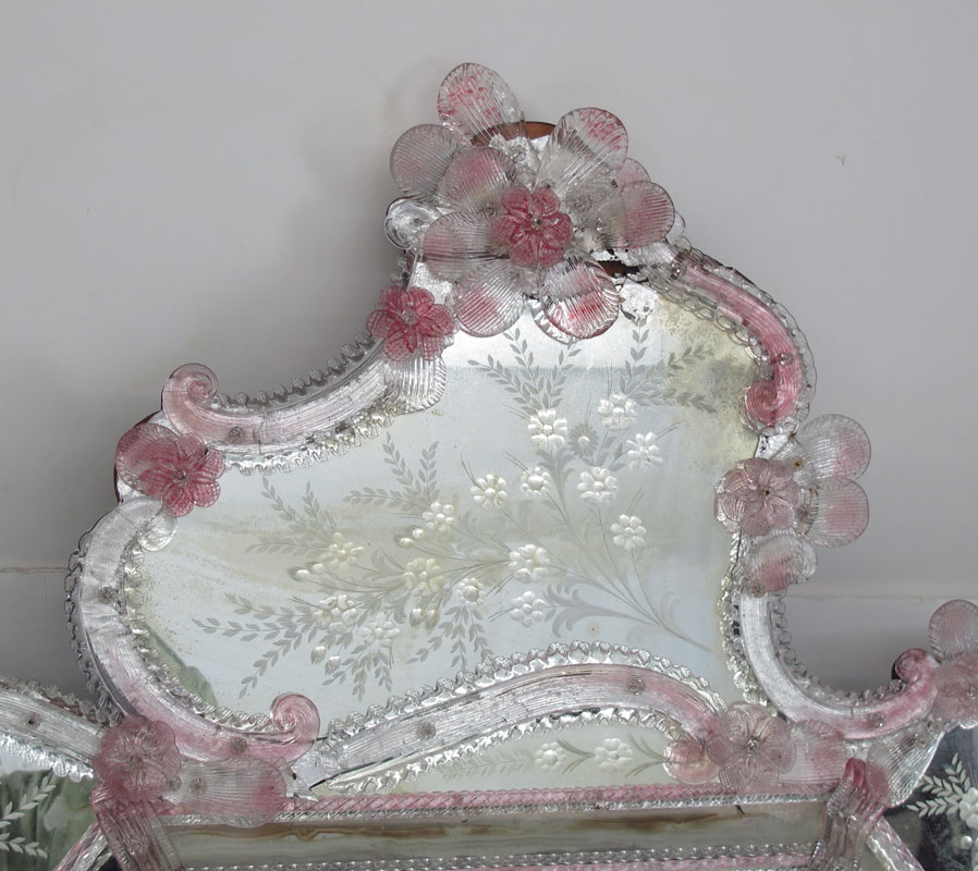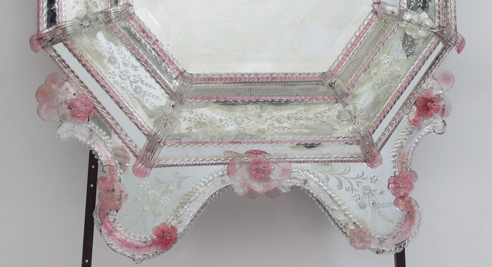 LARGE VENETIAN ETCHED GLASS MIRROR: Stepped frame with attached florets of pink tinted glass. Etched glass panels surround central mirror. Overall 63'' h. x 42'' x 3''