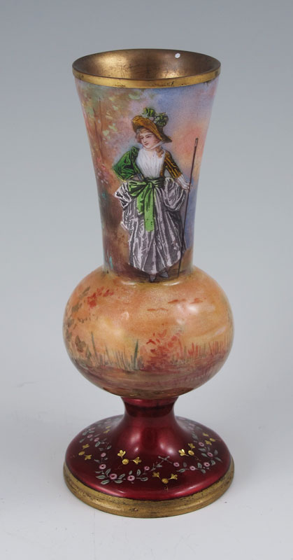 FRENCH ENAMEL VASE: Woman in landscape, 5.5'' tall.