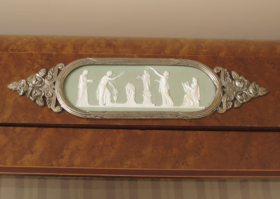 BURL VENEER CHINA CURIO WITH WEDGWOOD PLAQUE: Burl veneer triple door glass front with glass sides, 3 interior glass shelf. Wedgwood jasperware plaque affixed to front. Measures approx. 88'' h. x 62'' x 18''.