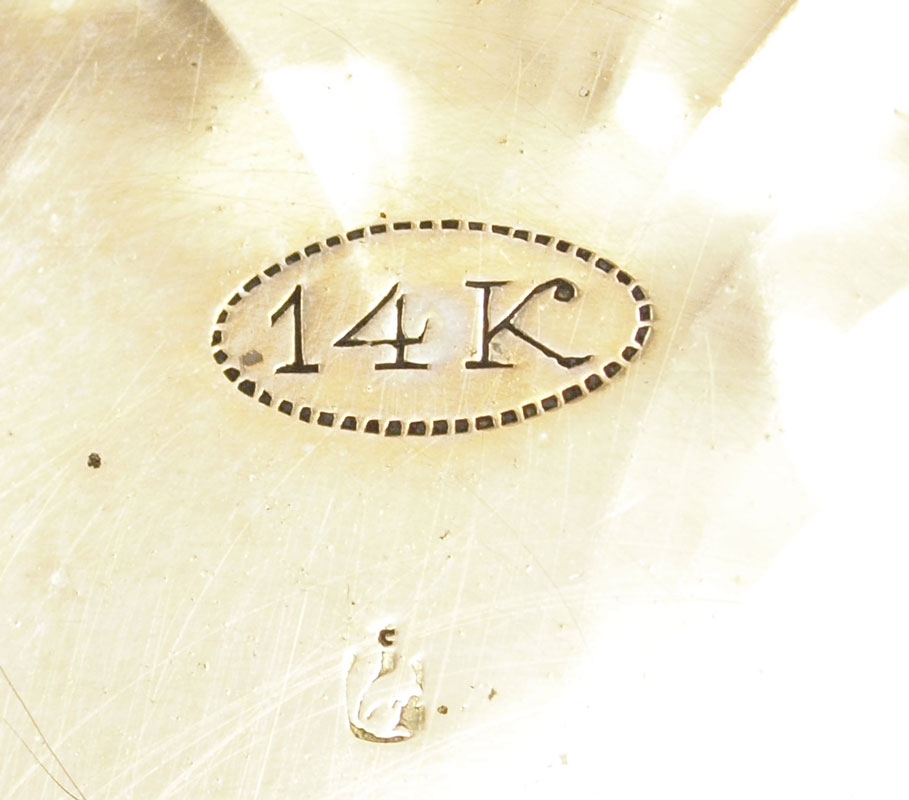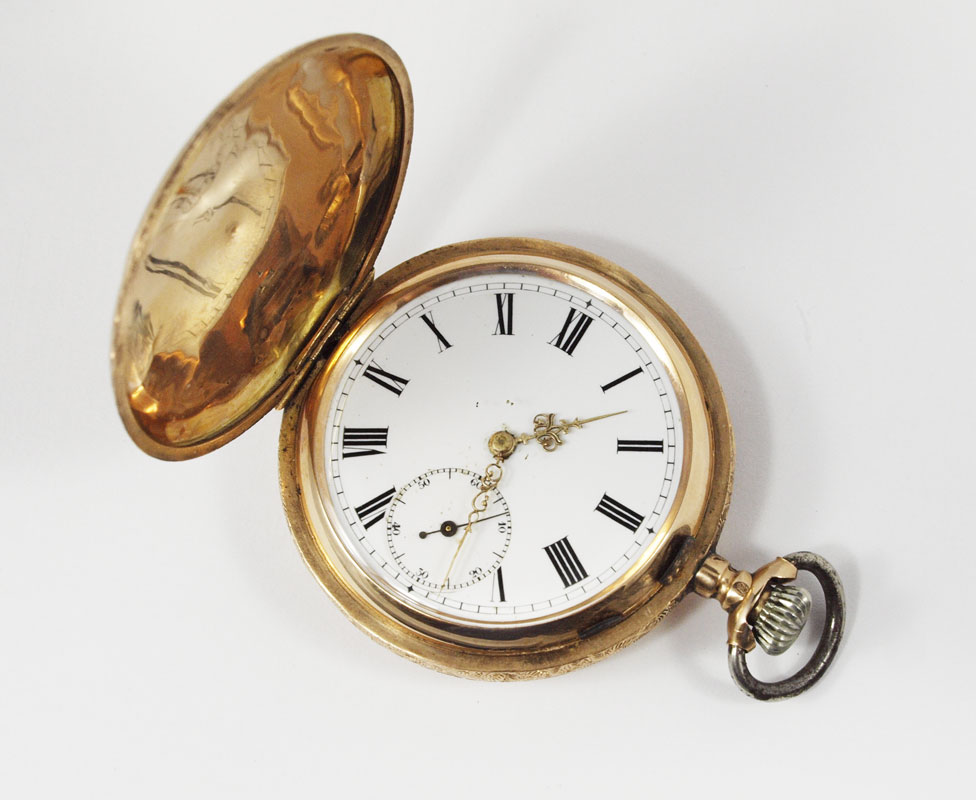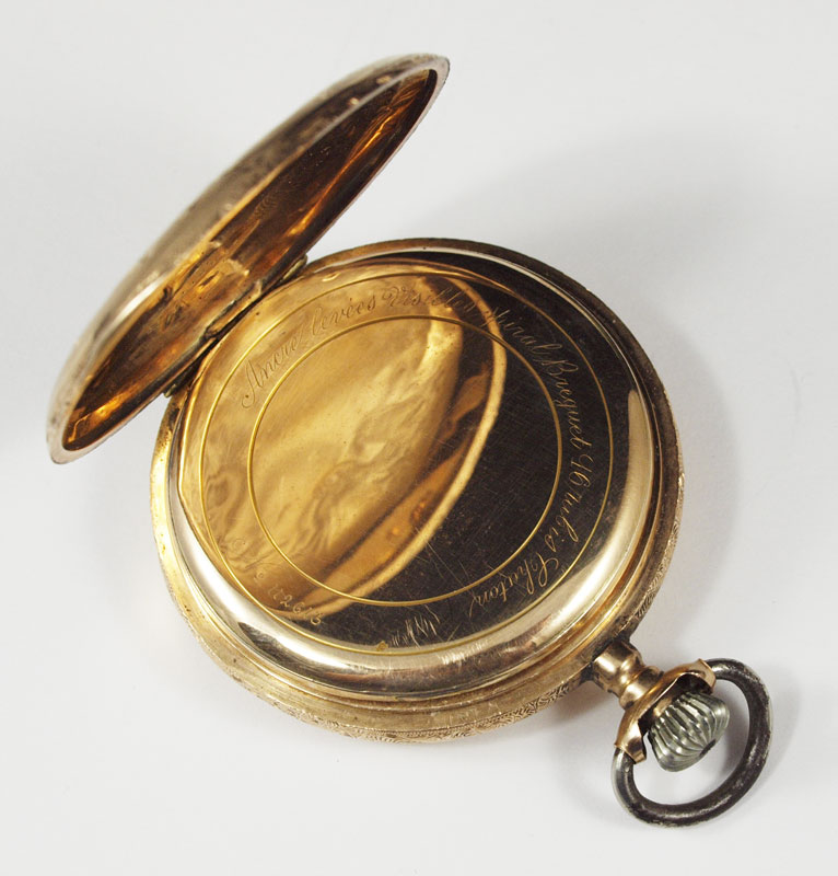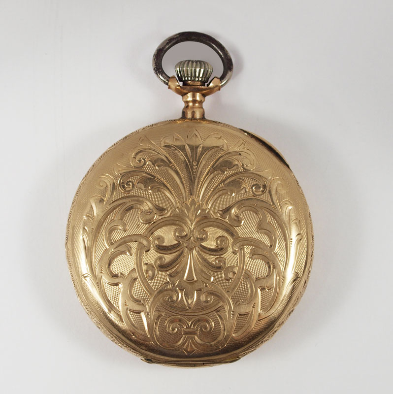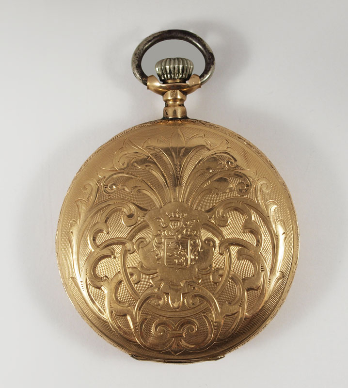 14K GOLD GENTS HUNTERS CASE POCKET WATCH ca. 1890: Beautifully engraved case centering a heraldic crest. Swiss made 15 jewel movement in good running order. Serial number on case 112613. Original dial with filigree hands and second sweep. Replaced crown. Overall weight 92.8 grams.
