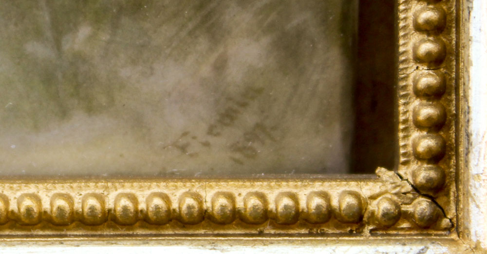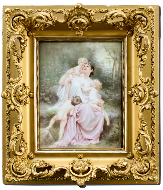 LARGE LIMOGES PAINTED PORCELAIN PLAQUE: Depicting a mother and 3 young children in landscape, 9 1/2'' x 7 1/2'', marked verso, encased in pierced, carved and gilded period gesso frame with wear and missing carving 15 1/2'' x 13 1/2''. Faint signature lower right.