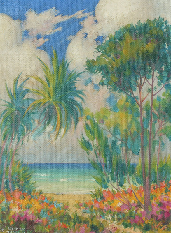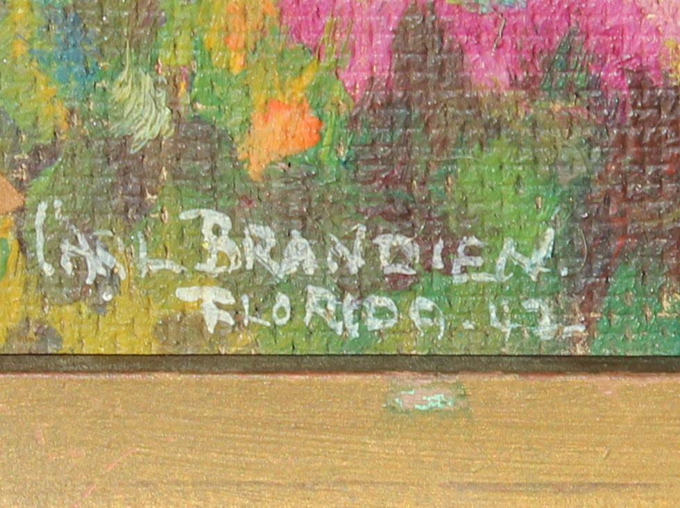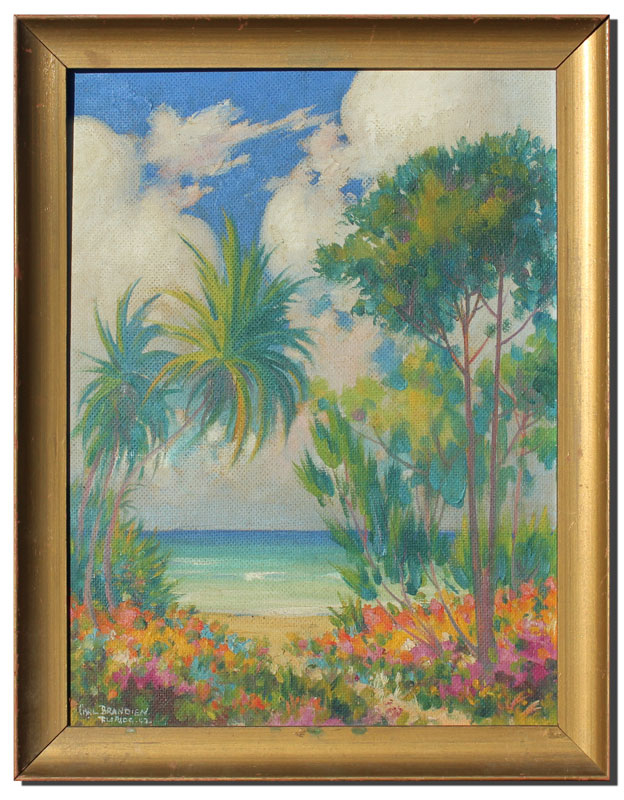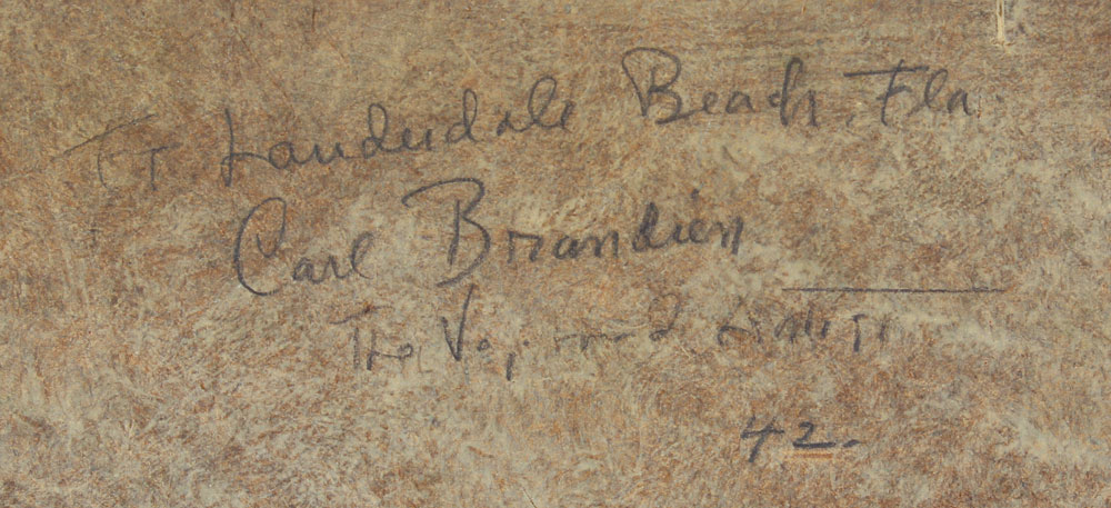 BRANDIEN, Carl, (American, 20th C.): ''Ft. Lauderdale Beach, Florida, OIL/Masonite, 16'' x 12'', signed lower left, marked Fl, dated '42, thin edge gold frame, 18'' x 14'', signed, titled and marked Vagabond Artist.