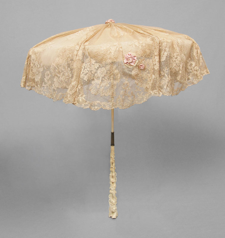 VICTORIAN CARVED IVORY HANDLE PARASOL: Folding parasol of point de gase lace over silk. The ivory handle is carved as a leafy vine. Total length 22''. Handle length 10 1/2''.