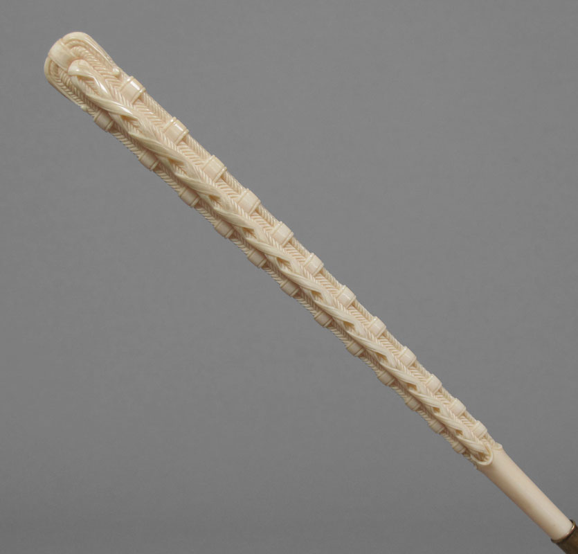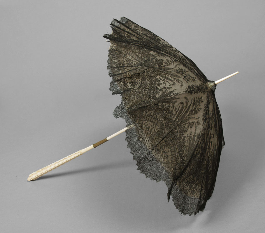 VICTORIAN CARVED IVORY HANDLE PARASOL: Folding parasol of black point de gase lace over silk. The ivory handle is carved in a woven geometric pattern. Total length approx. 27''. Handle length 11''.