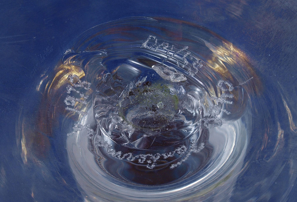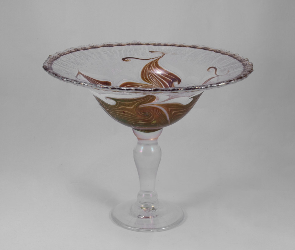 VANDERMARK ART GLASS COMPOTE: Scalloped rim with etched glass, caramel and white pulled feather design center. Marked etched signature Vandermark, 1978, DM/SS, 0460. 7'' h. x 8 1/2'' dia.