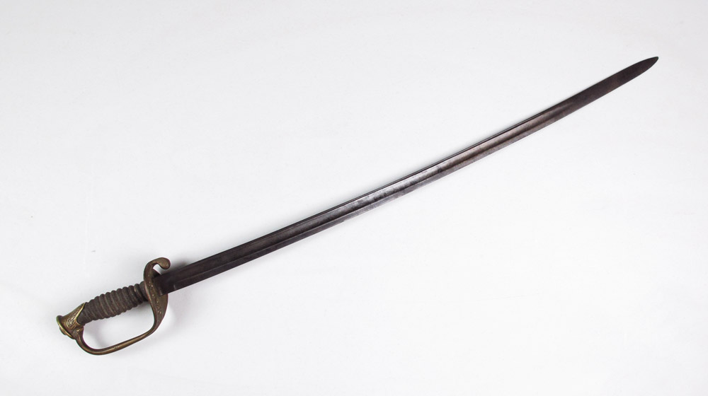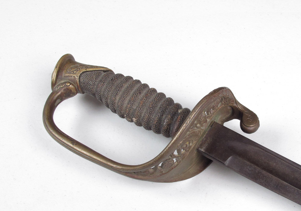CIVIL WAR ERA FOOT OFFICERS SWORD: Most likely an import, Brass hilt with original sharks skin wrap, missing wire. Unmarked dark 31'' blade with traces of etching remaining. No scabbard. Overall 37'' l.