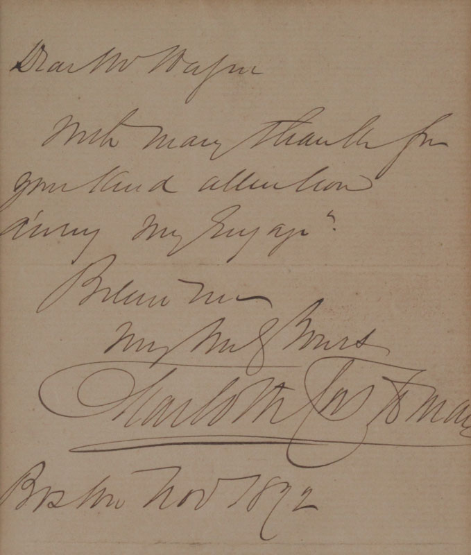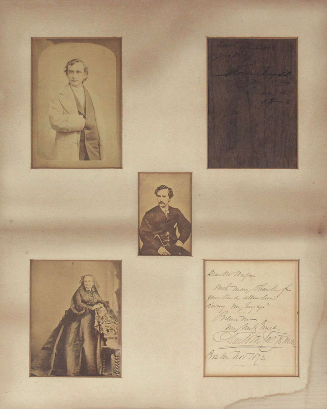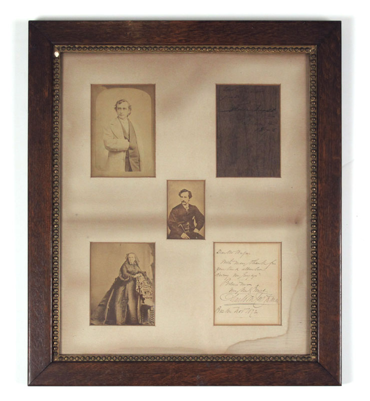 FRAMED CDV'S AND AUTOGRAPH OF EDWIN BOOTH: Framed collection of CDV's of actors from the 1870's to include 1) Photograph of Edwin Booth, brother of John Wilkes Booth, the actor who shot Abraham Lincoln. 2) Edwin Booth autograph. 3) CDV of J. W. Hague (aka John W. Walker), and actor who acted with Booth. 4) Photograph of an unknown actress. 4) Illegibly signed letter to Hague dated Boston, Nov. 1872. Framed in period frame under glass. Measures 21 1/2'' h x 18 1/4''.