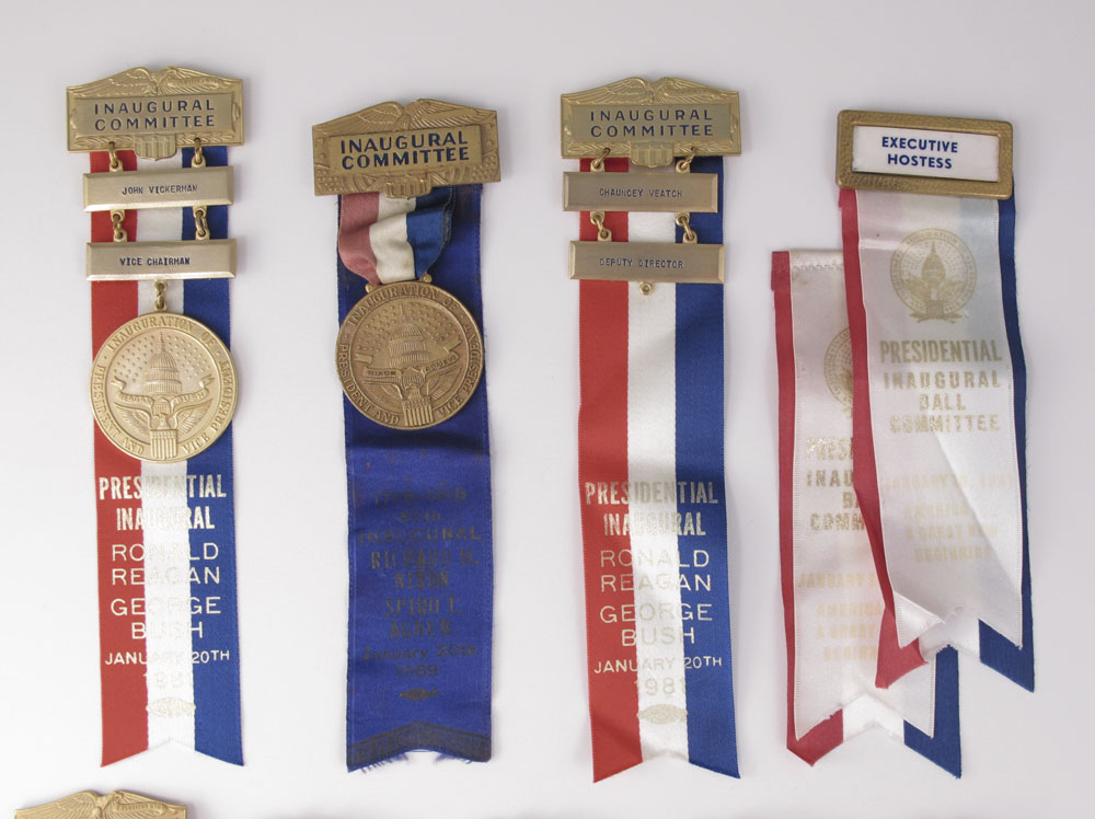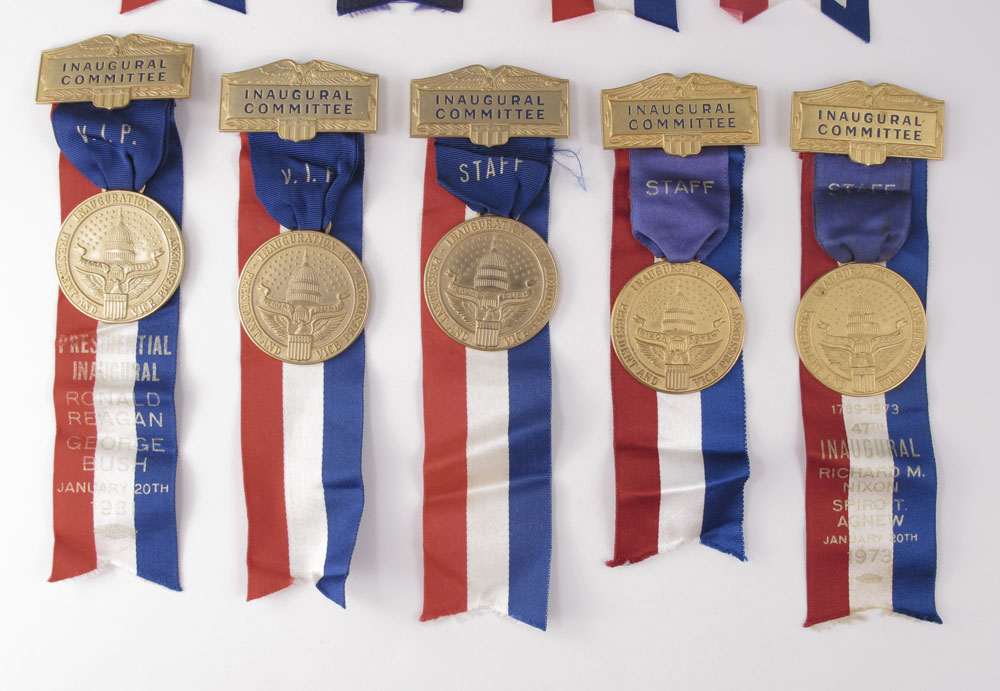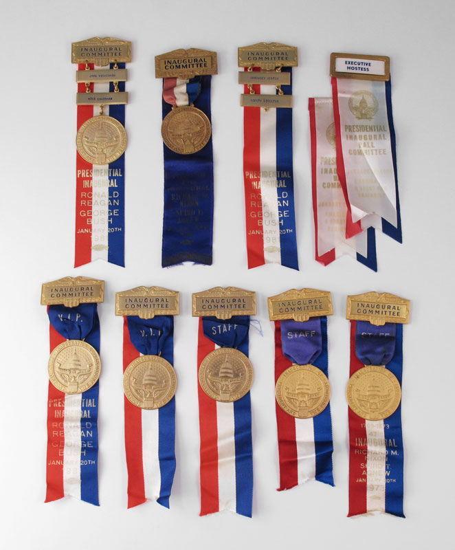 COLLECTION OF REAGAN AND NIXON INAUGURAL COMMITTEE RIBBONS: To include 1) 6 Ronald Reagan / George Bush 1981 ribbons, Vice Chairman, Executive Hostess, Deputy Director, 2 VIP and one Staff. 2) 3 Richard Nixon and Spiro T. Agnew ribbons, one from 1969, 2 staff from 1973.